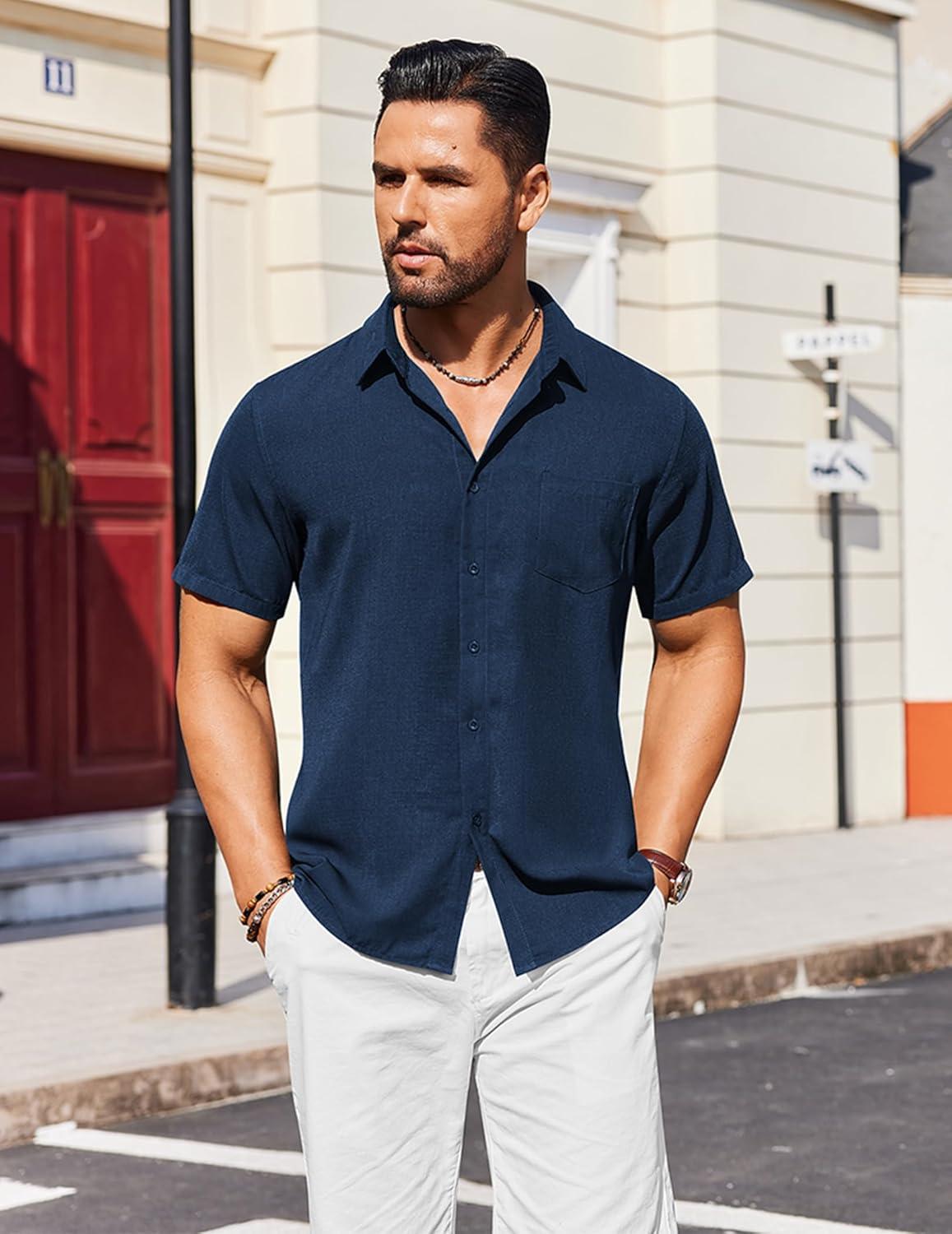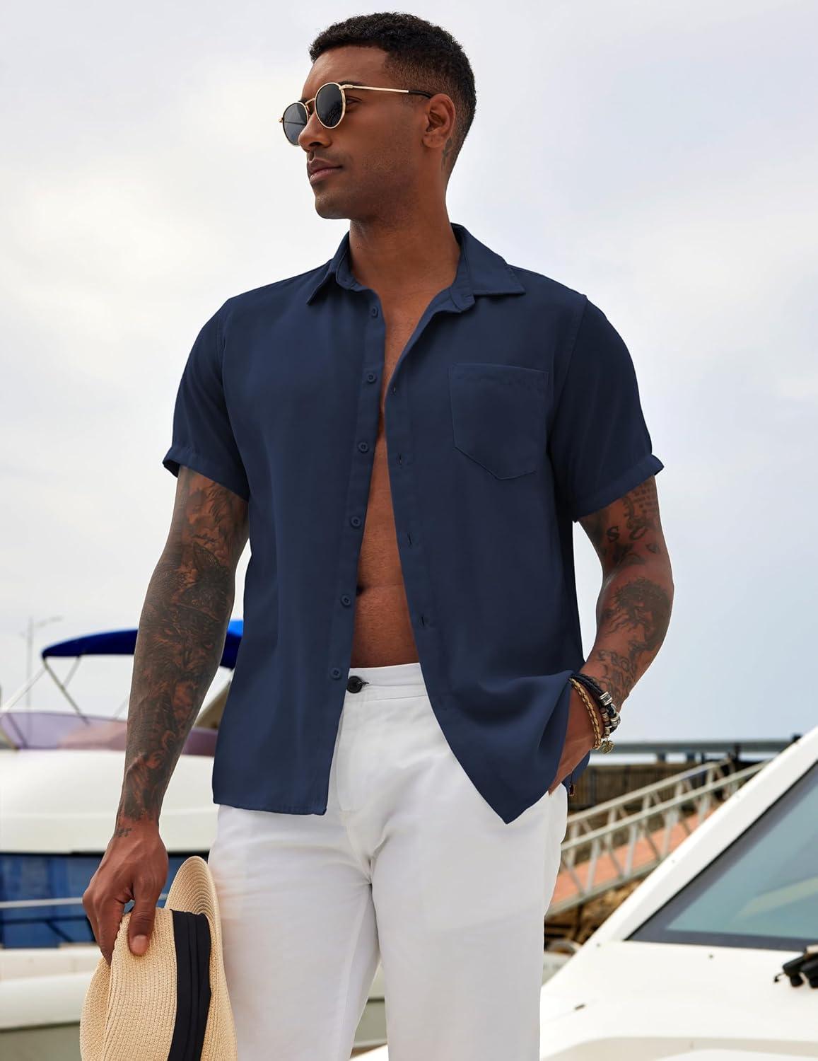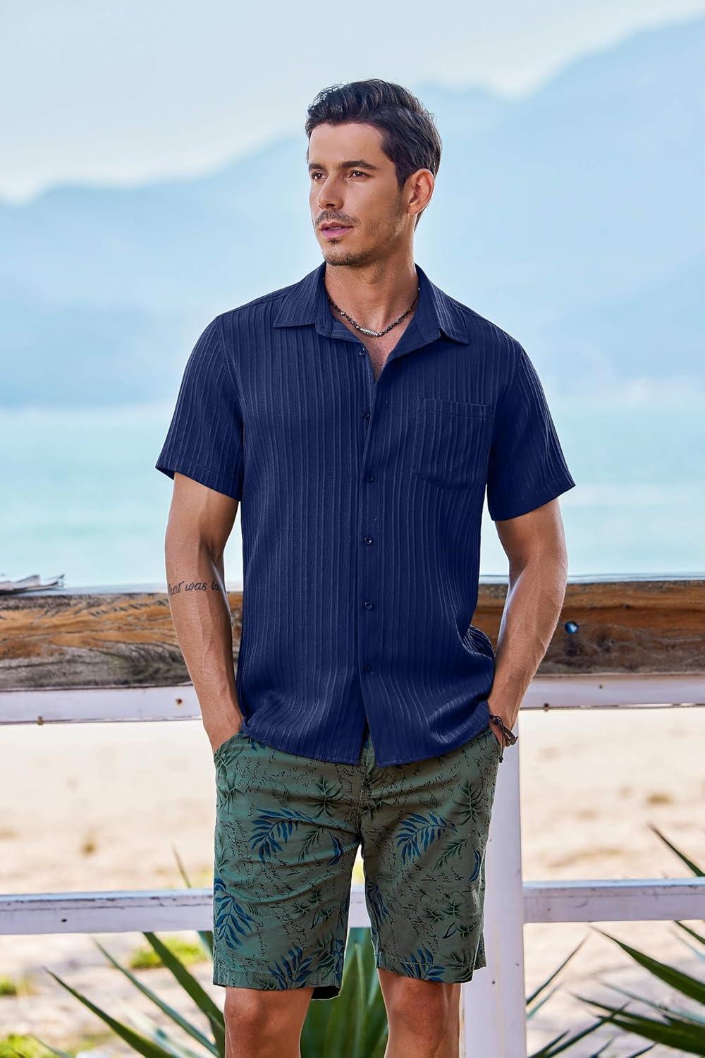 COOFANDY Men’s Short Sleeve Casual Button Down Shirts Textured Summer Beach Shirt with Pocket(Navy Blue)
