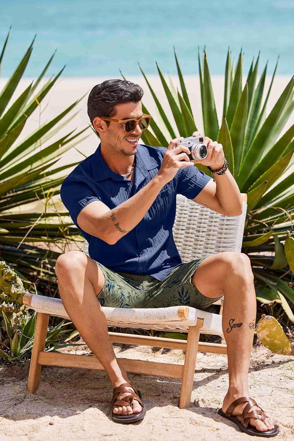 COOFANDY Mens Casual Short Sleeve Shirts Button Down Textured Shirts Summer Beach Shirt with Pocket(Navy Blue)