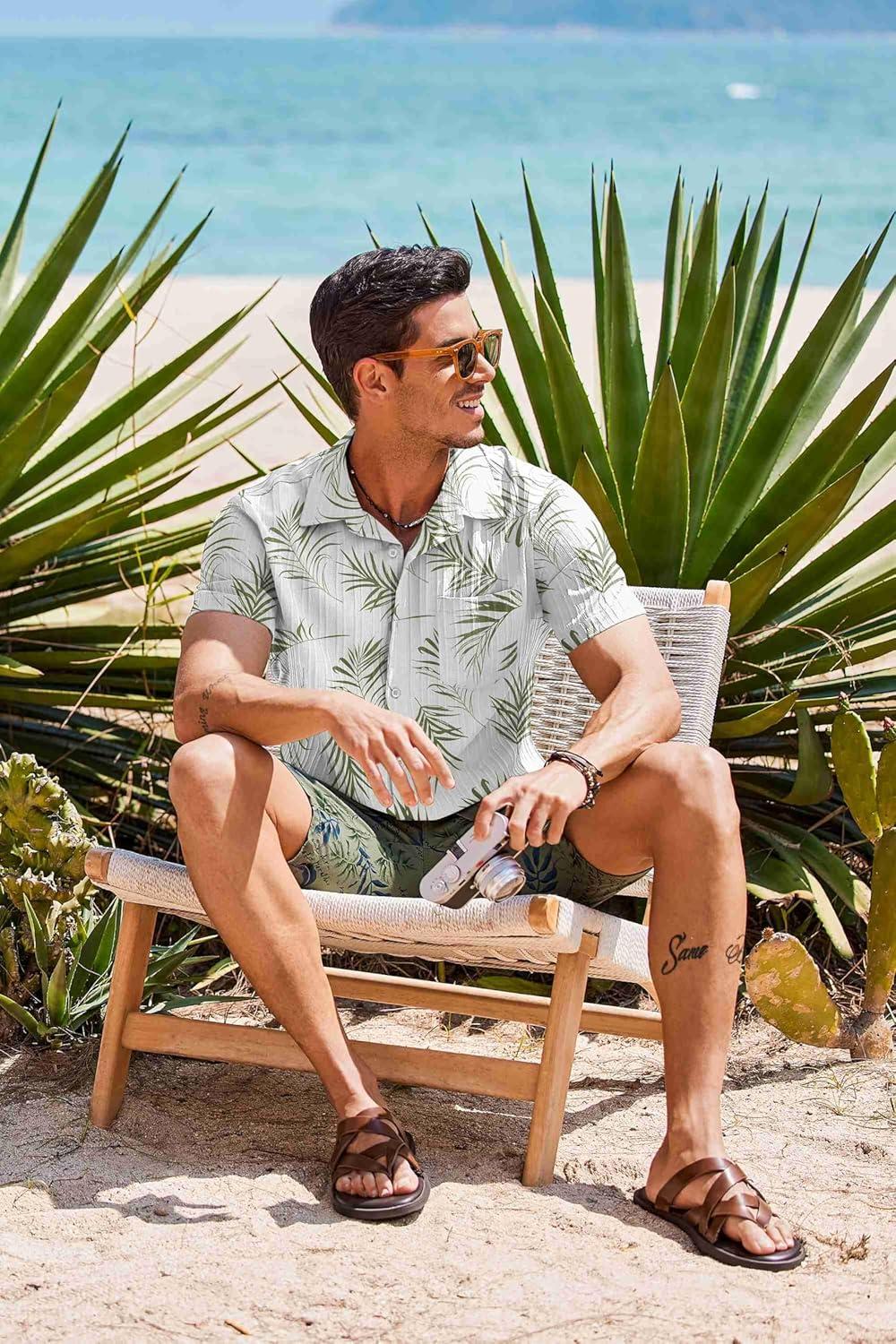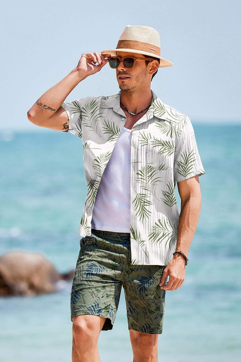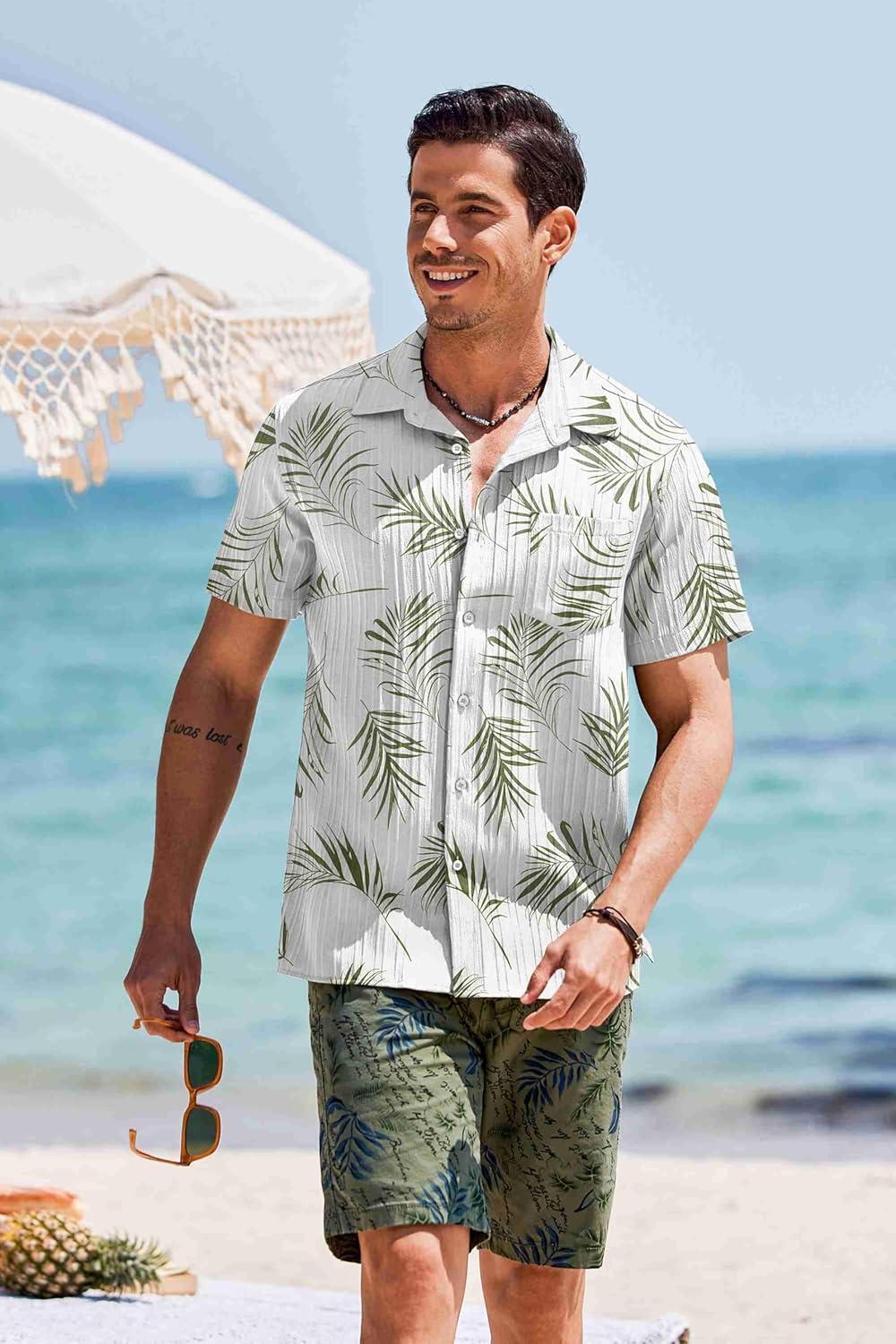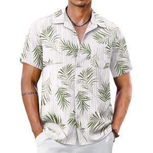 COOFANDY Men’s Short Sleeve Casual Button Down Shirts Textured Summer Beach Shirt with Pocket(White-green Leaves)