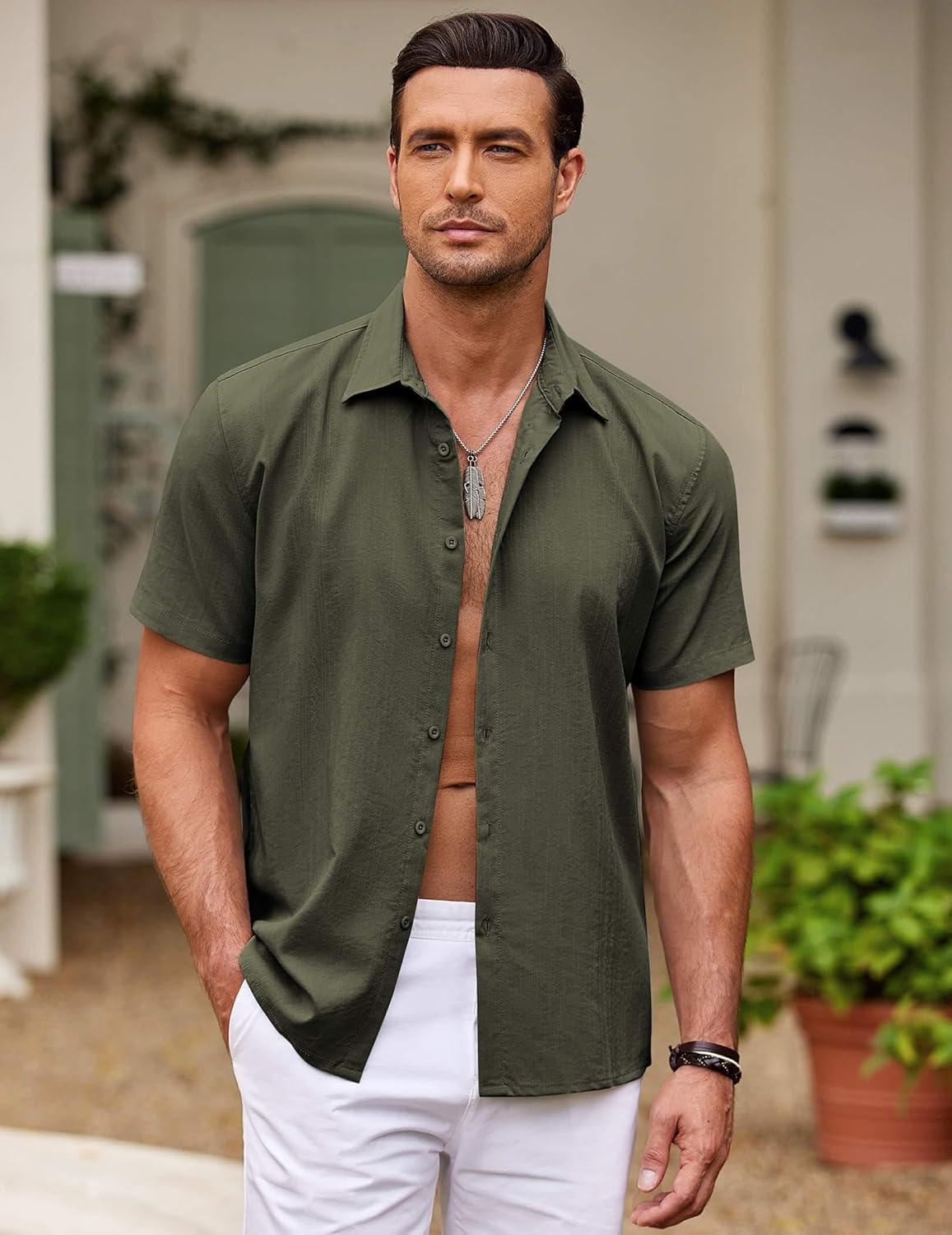 COOFANDY Men’s Cuban Guayabera Shirt Short Sleeve Button Down Shirts Casual Summer Beach Shirts(Army Green)