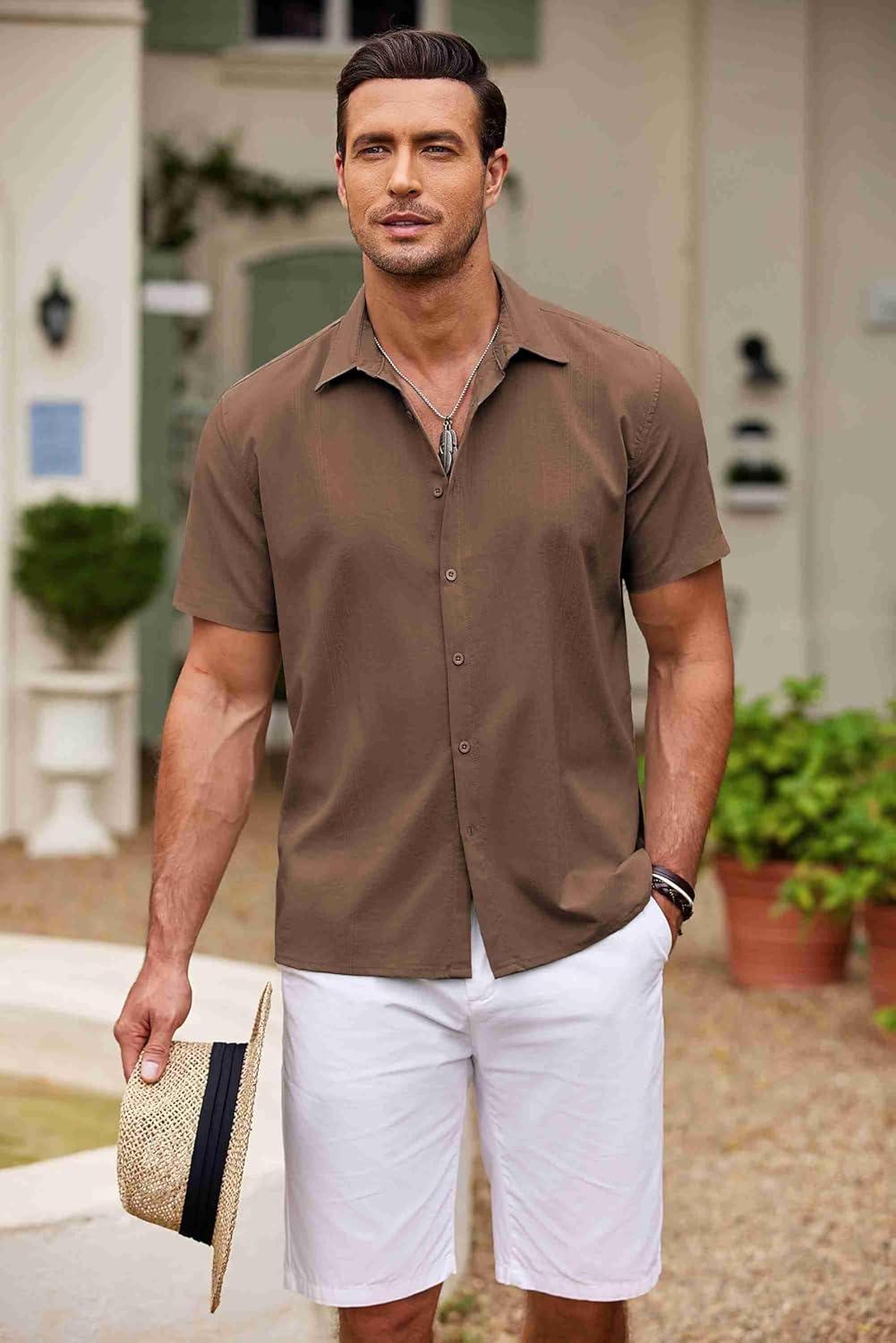 COOFANDY Men’s Cuban Guayabera Shirt Short Sleeve Button Down Shirts Casual Summer Beach Shirts(Brown)