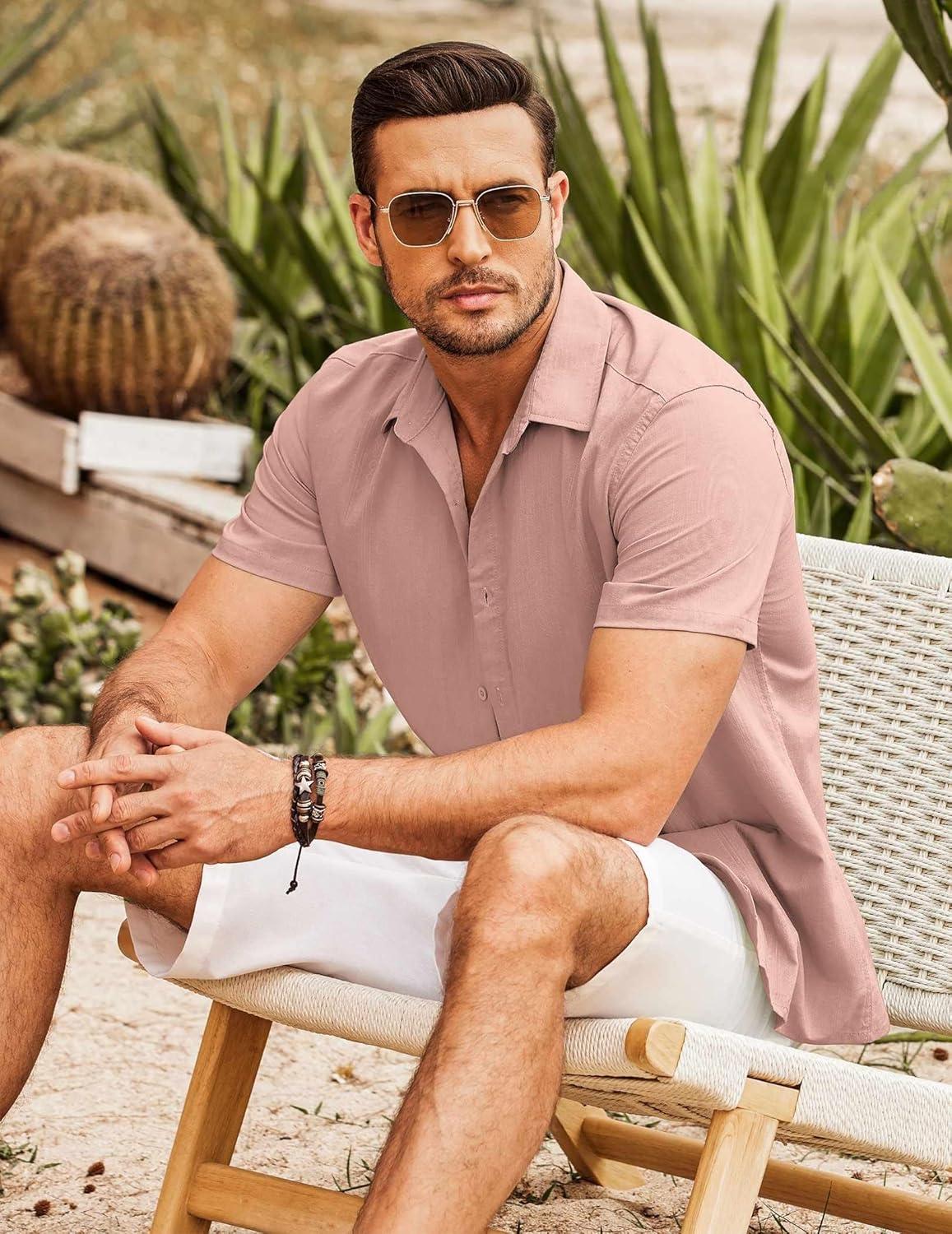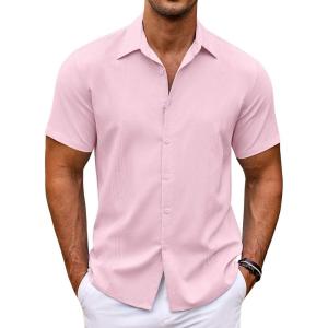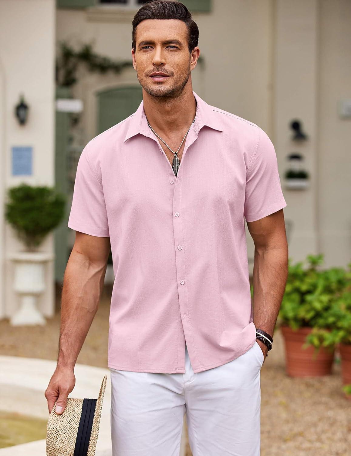 COOFANDY Men’s Cuban Guayabera Shirt Short Sleeve Button Down Shirts Casual Summer Beach Shirts(Light Pink)