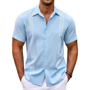 COOFANDY Men’s Cuban Guayabera Shirt Short Sleeve Button Down Shirts Casual Summer Beach Shirts(Sky Blue)