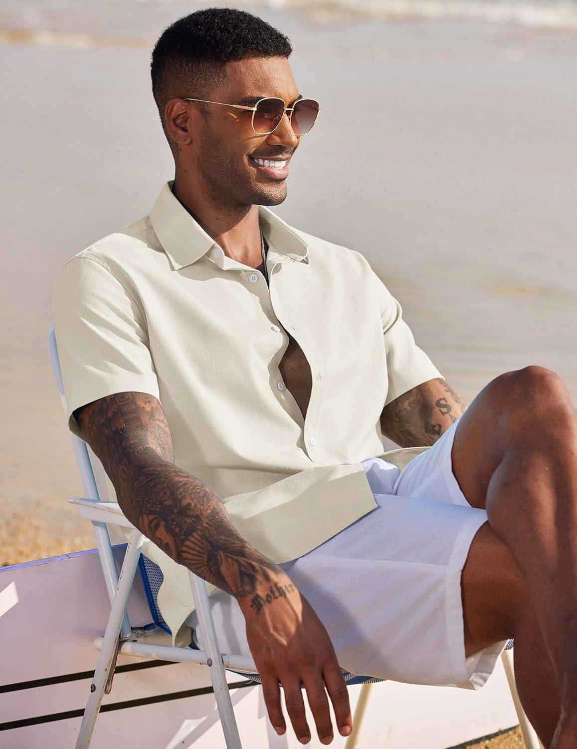 • COOFANDY Mens Shirt Casual Button Down Short Sleeve Shirt Summer Cotton Linen Beach Shirts(Light Khaki)
