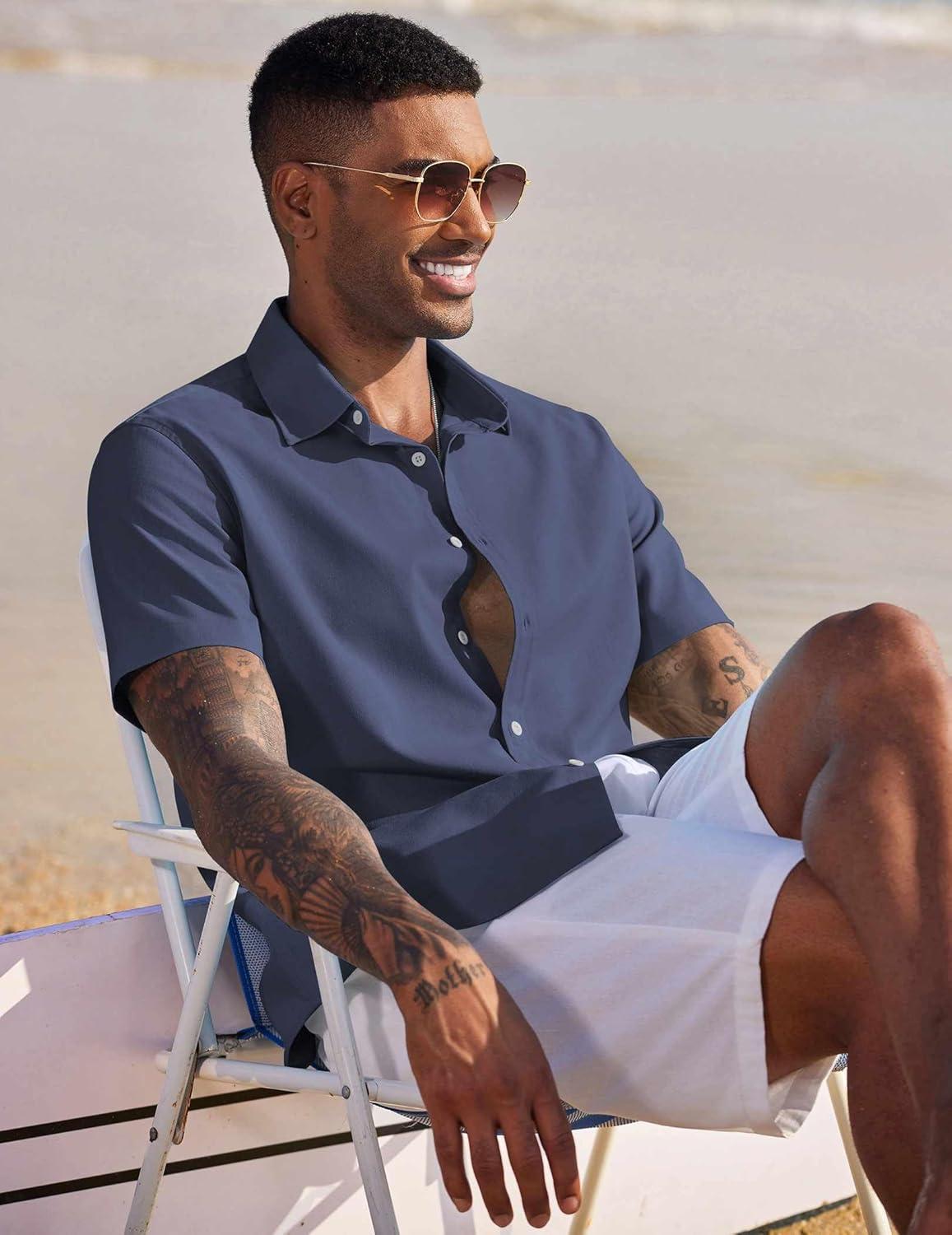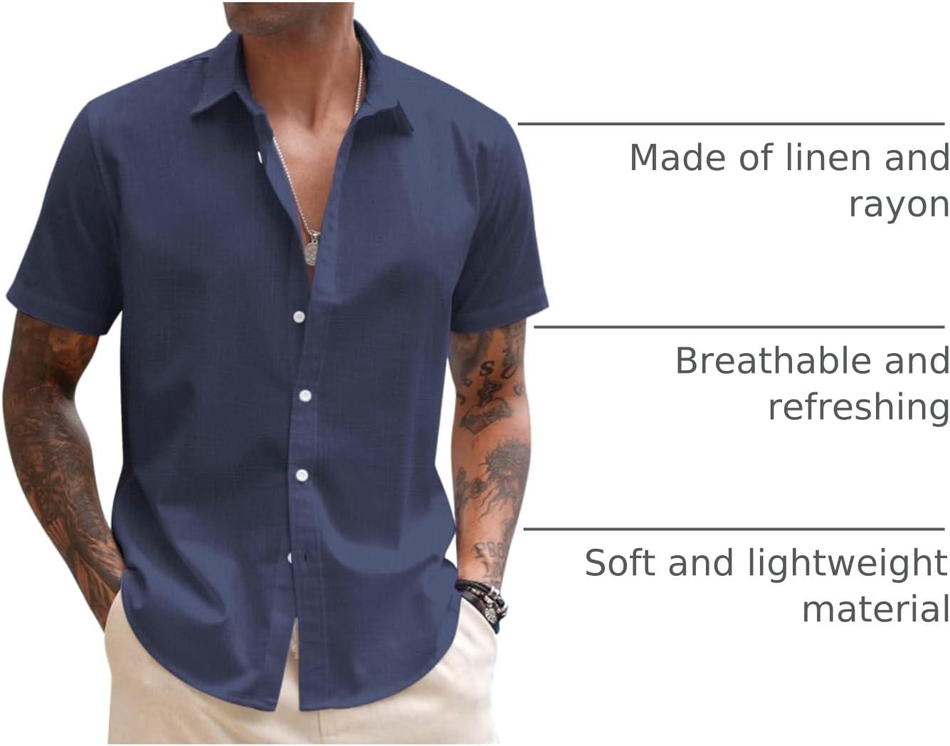 • COOFANDY Mens Shirt Casual Button Down Short Sleeve Shirt Summer Cotton Linen Beach Shirts(Navy Blue)