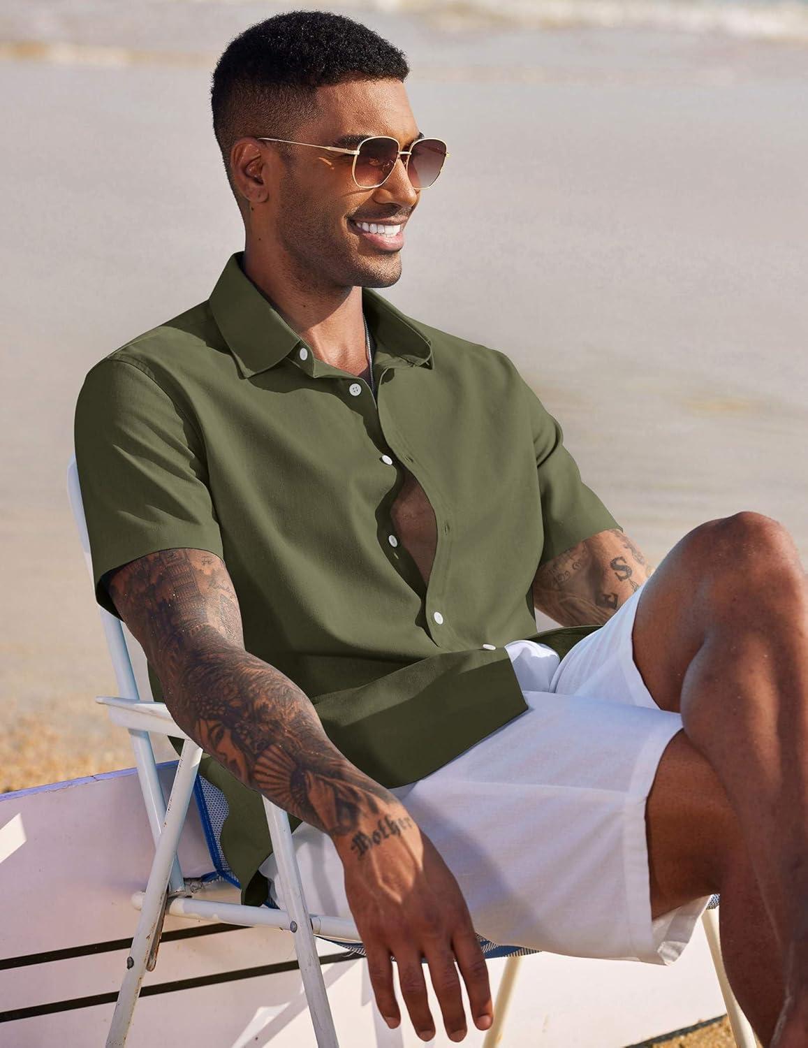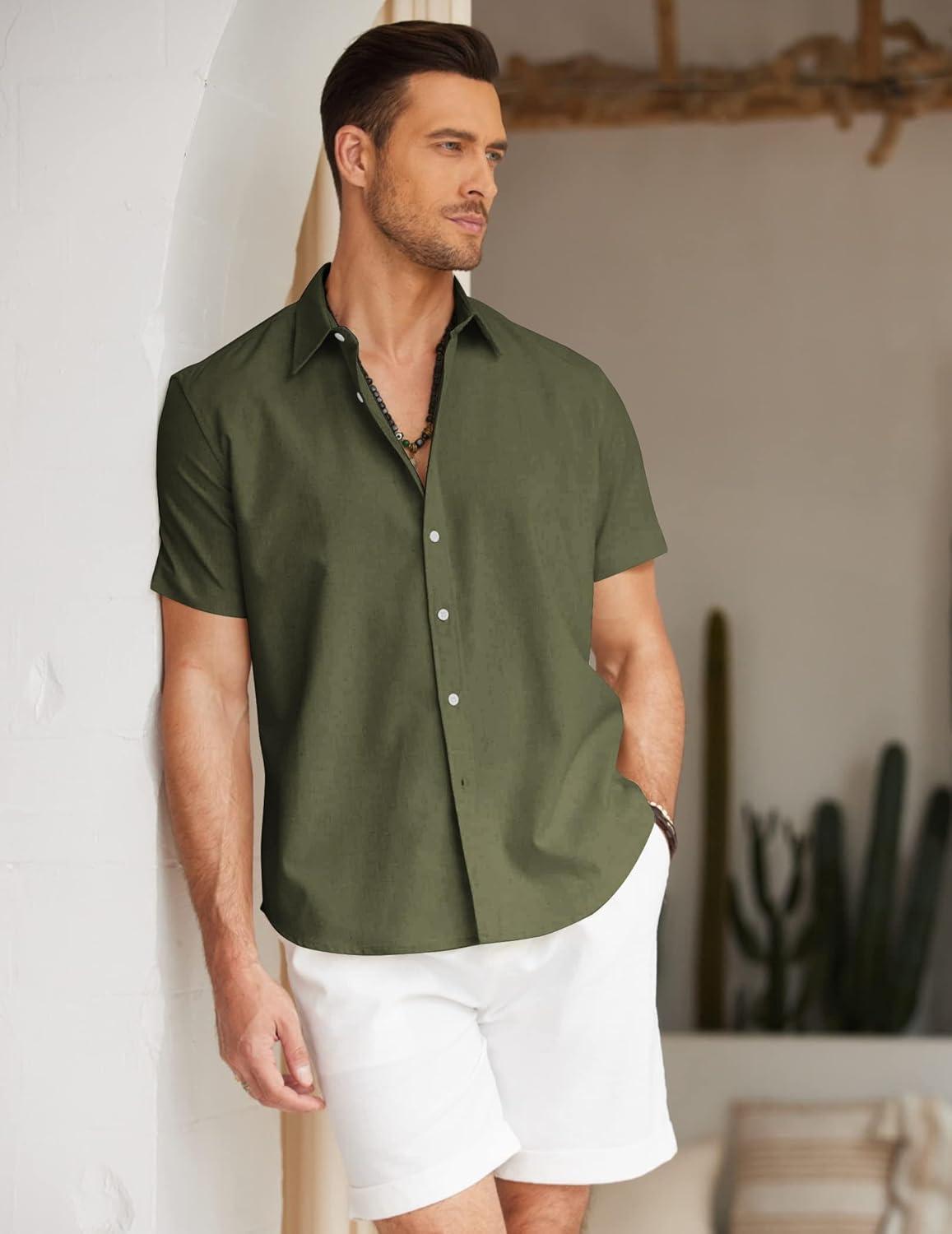 • COOFANDY Mens Shirt Casual Button Down Short Sleeve Shirt Summer Cotton Linen Beach Shirts(Olive Green)
