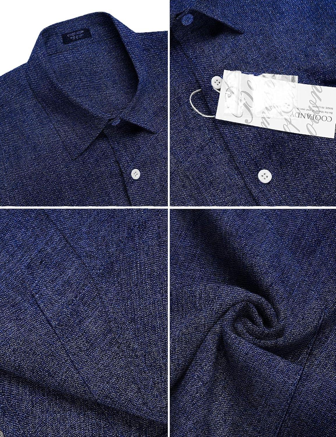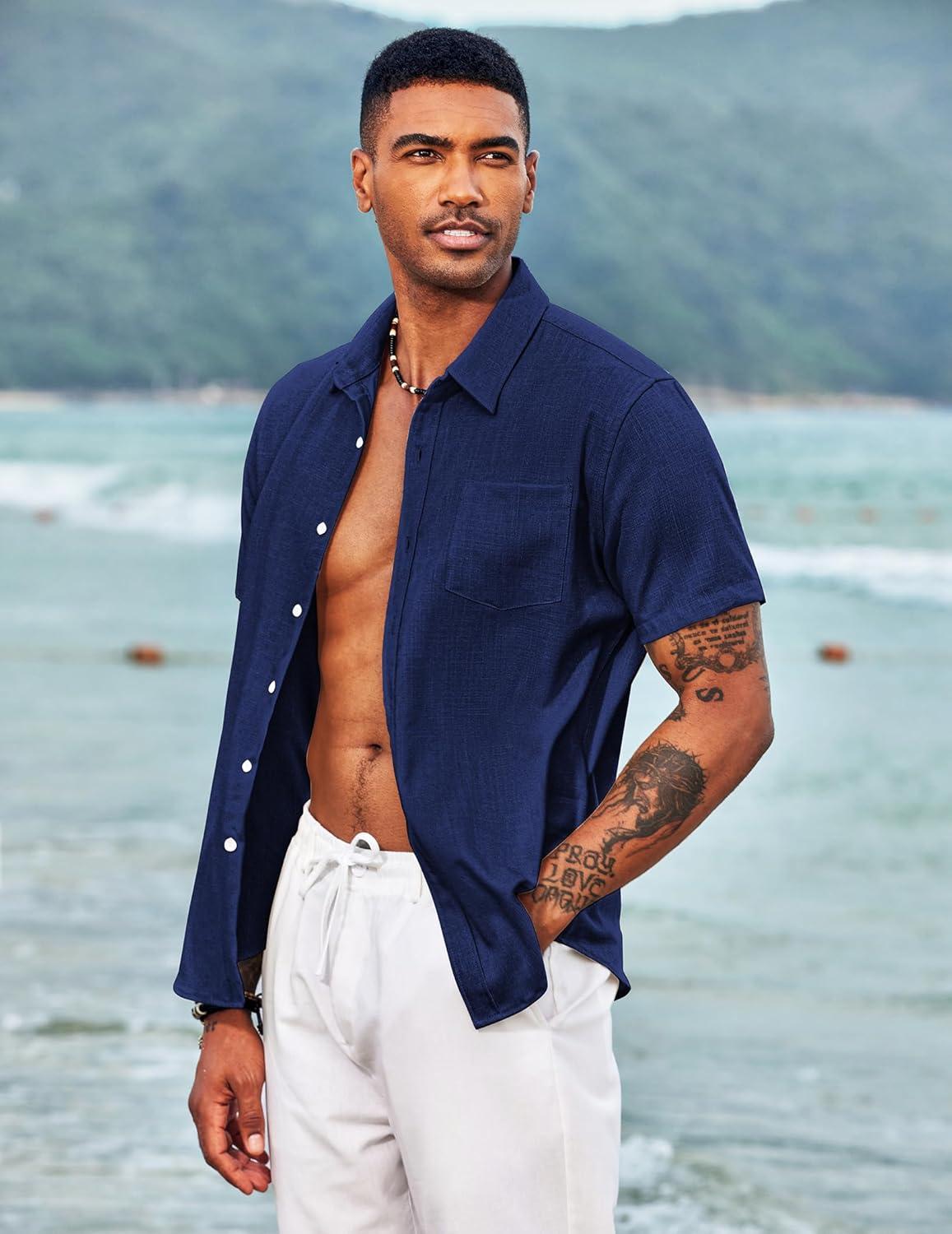COOFANDY Men’s Casual Button Down Shirts Short Sleeve Linen Shirts Summer Beach Dress Shirt(Blue)