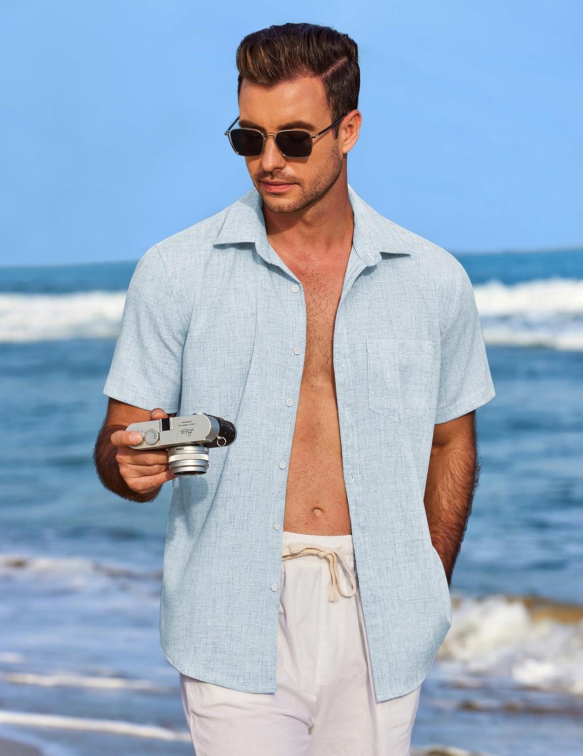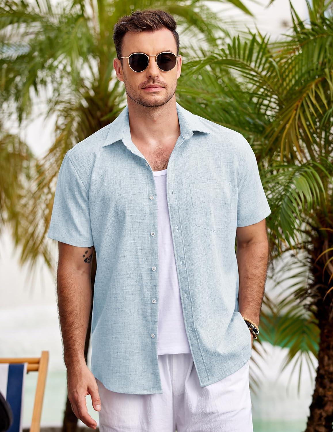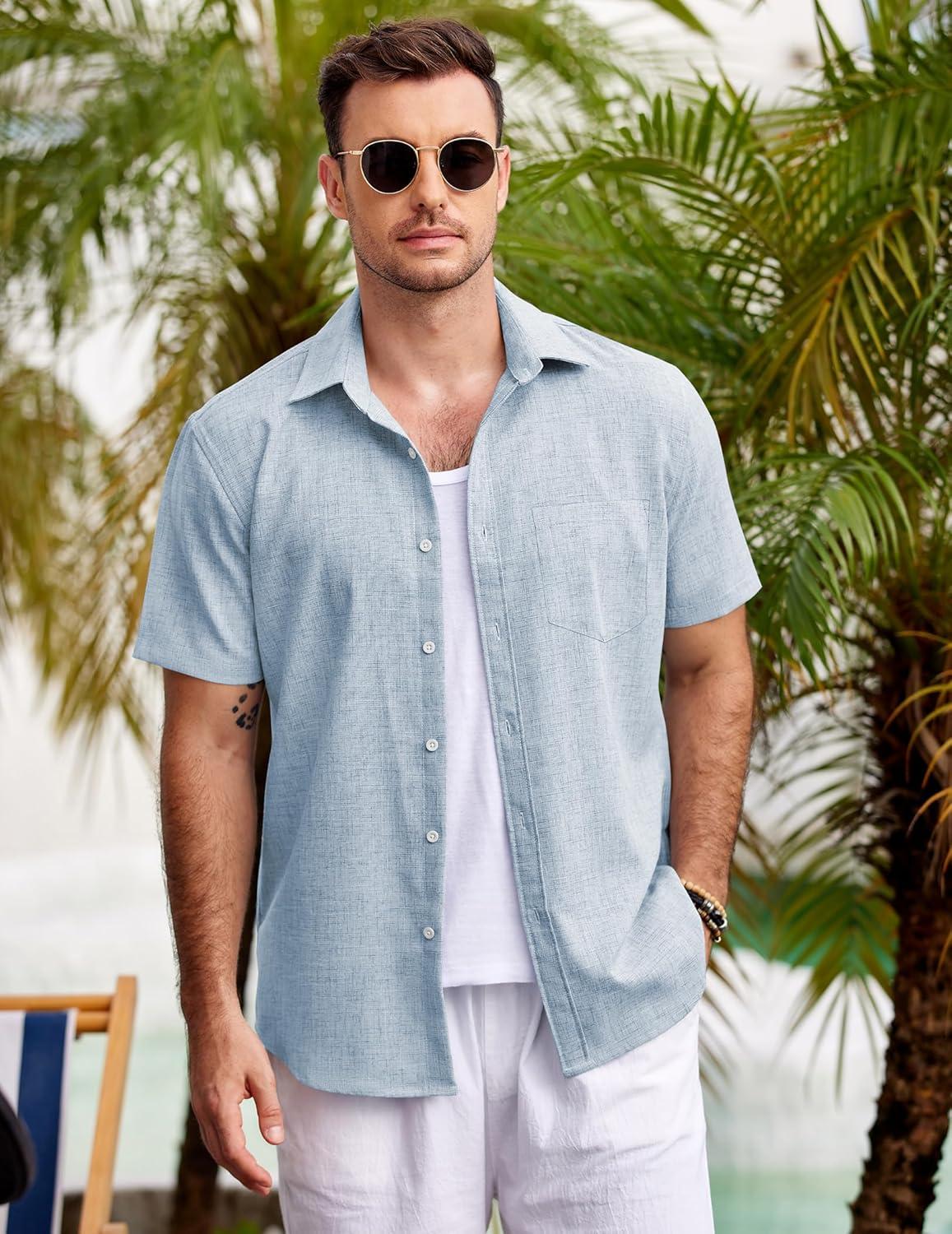 COOFANDY Men’s Casual Button Down Shirts Short Sleeve Linen Shirts Summer Beach Dress Shirt(Clear Blue)
