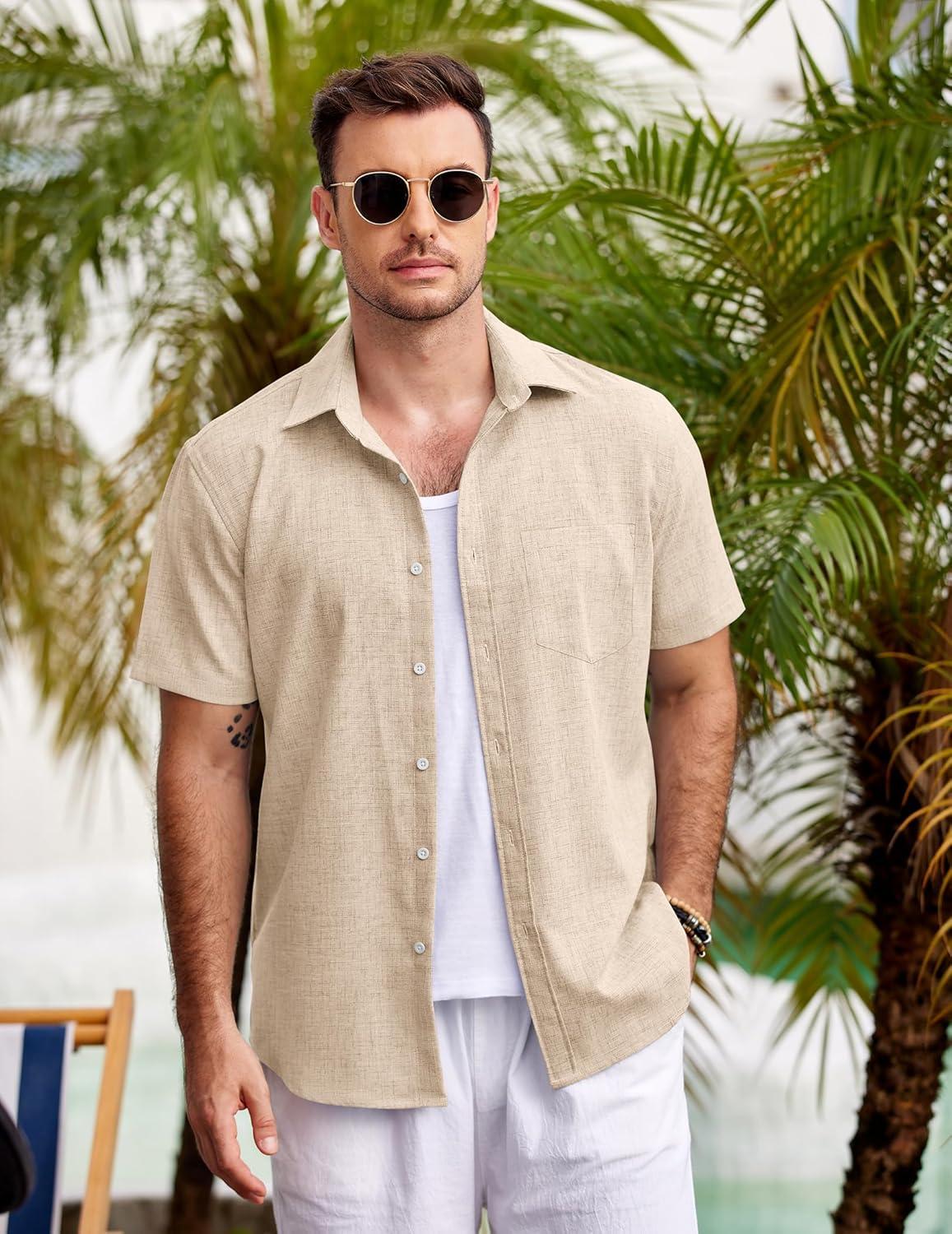COOFANDY Men’s Casual Button Down Shirts Short Sleeve Linen Shirts Summer Beach Dress Shirt(Khaki)