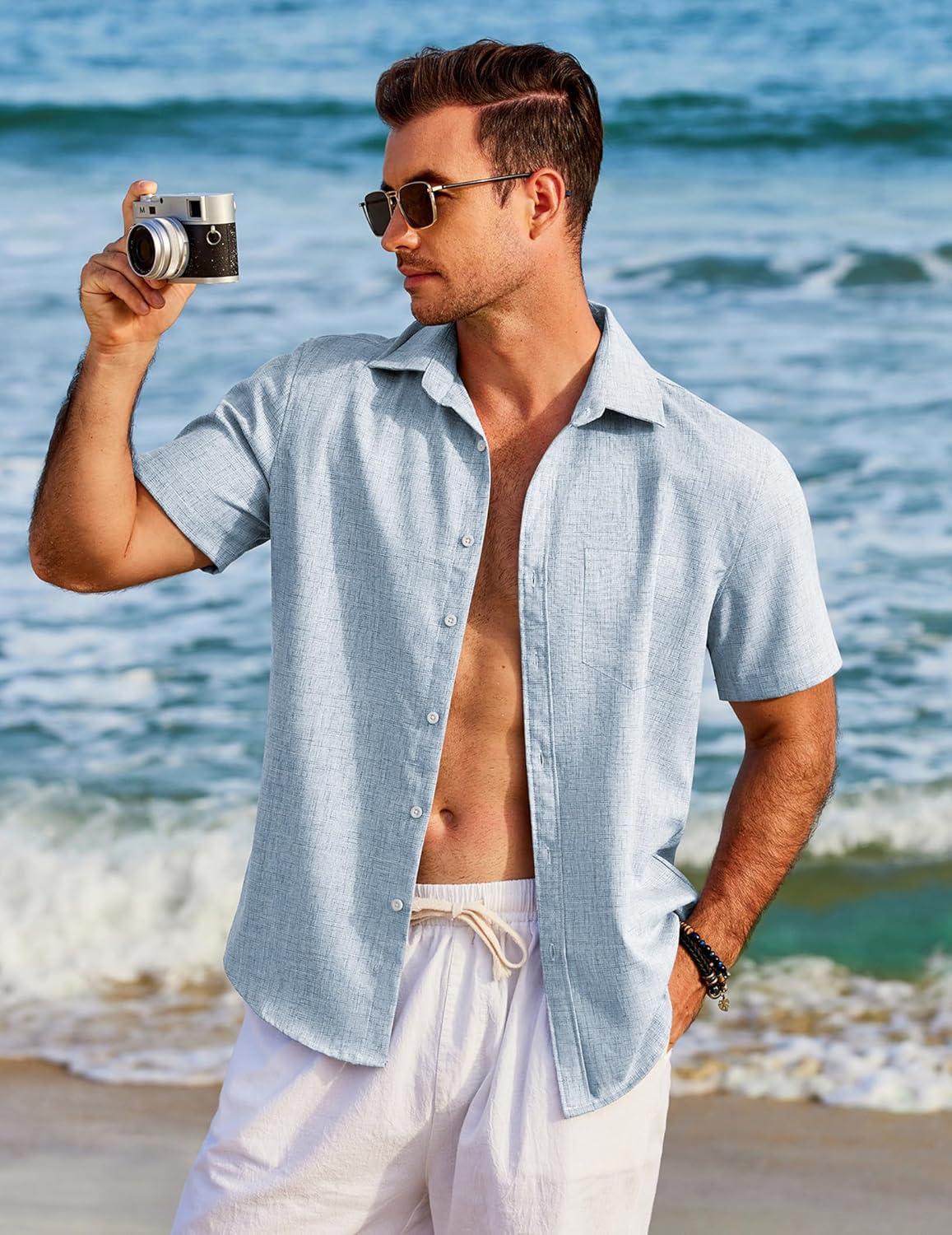 COOFANDY Men’s Casual Button Down Shirts Short Sleeve Linen Shirts Summer Beach Dress Shirt(Linen – Flecking Light Blue)