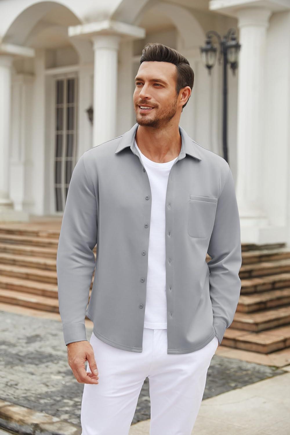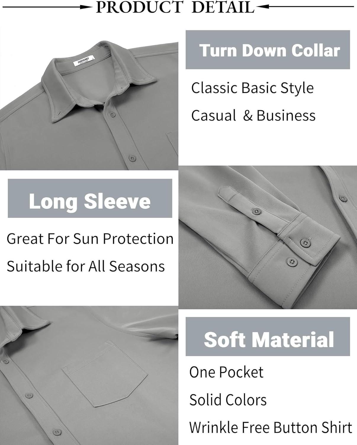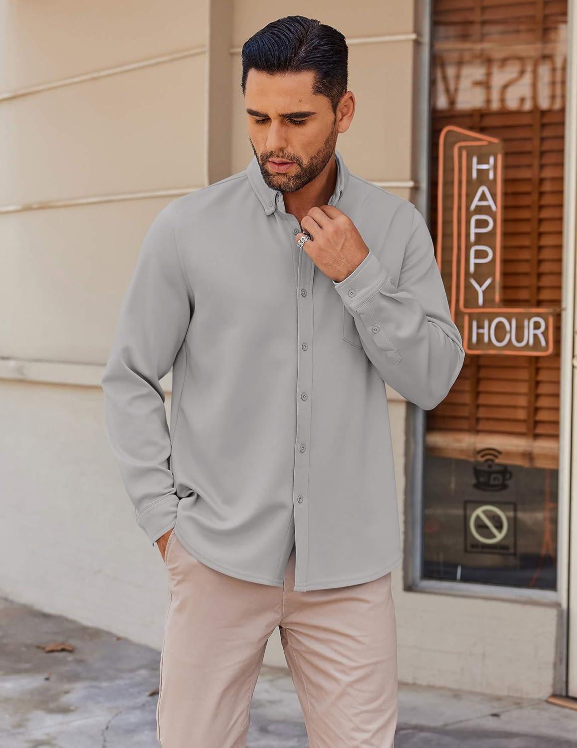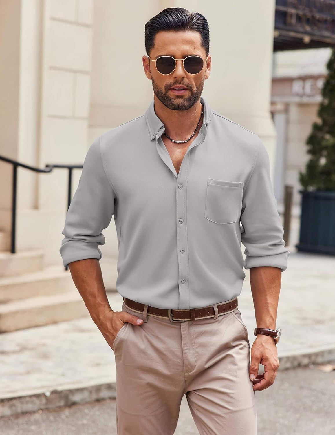 COOFANDY Men’s Long Sleeve Wrinkle Free Shirt Casual Button Down Shirts Stretch Dress Shirt with Pocket(Light Grey)