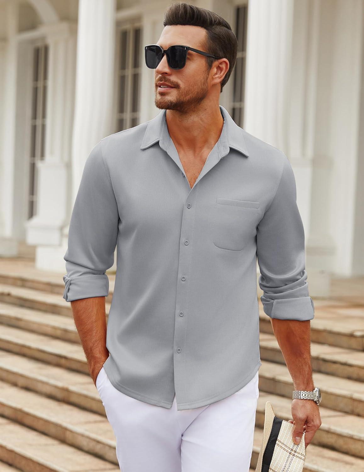 COOFANDY Mens Long Sleeve Button Down Shirt Wrinkle Free Casual Shirt for Men Untucked Shirts with Pocket for Wedding(Light Grey)