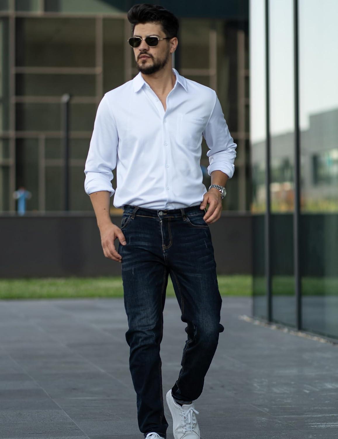 COOFANDY Mens’s Long Sleeve Button Up Shirts Athletic Fitted Dress Shirts Silm Fit(White)