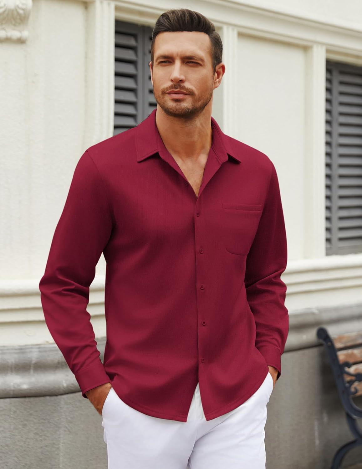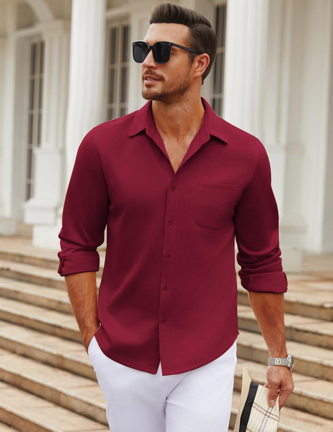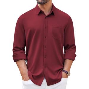 COOFANDY Men’s Long Sleeve Button Down Shirts Casual Untucked Dress Shirt Beach Wedding Shirts(Wine Red)