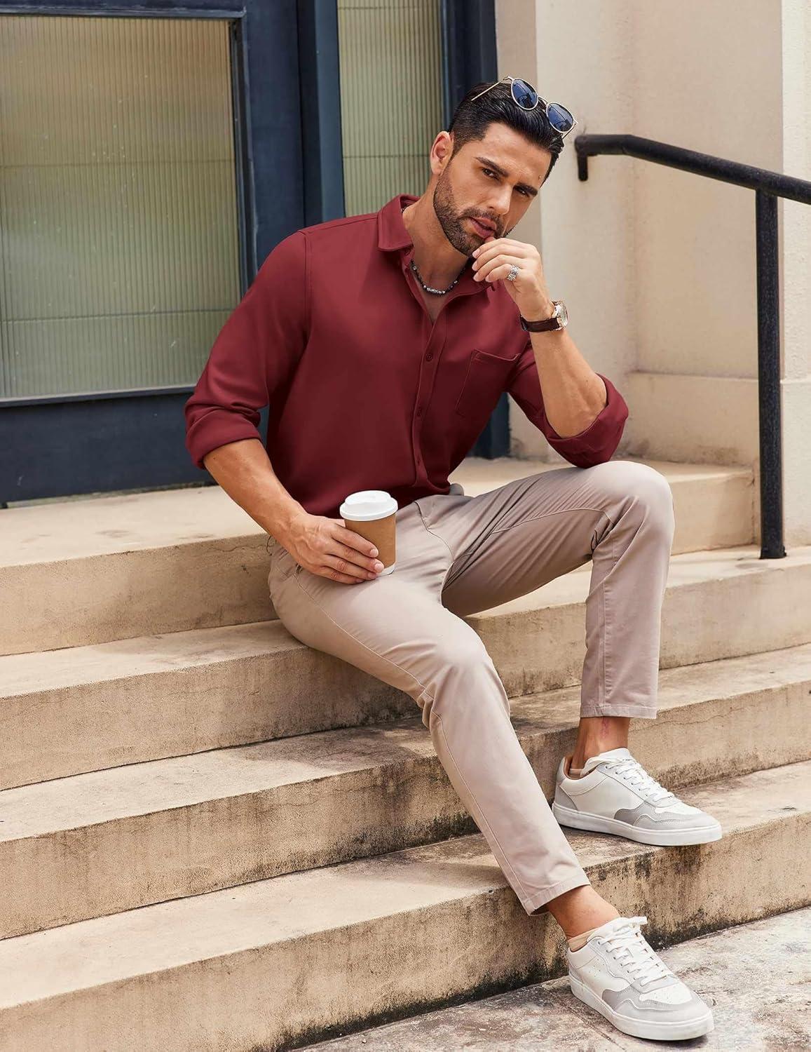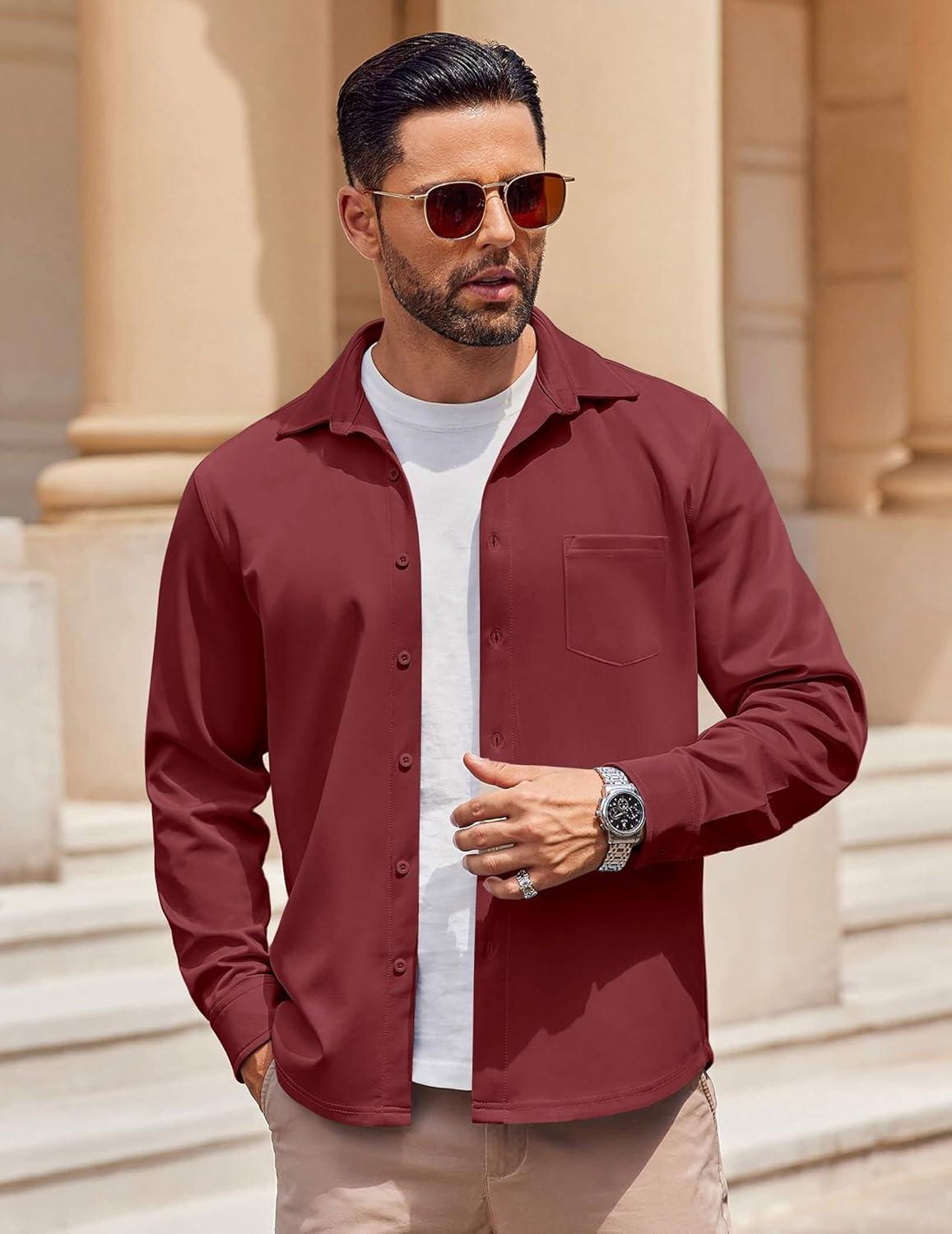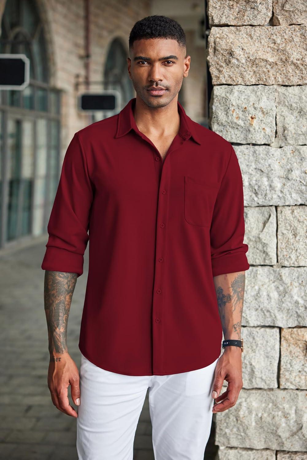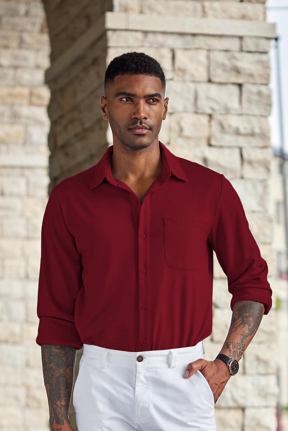COOFANDY Men’s Long Sleeve Wrinkle Free Shirt Casual Button Down Shirts Stretch Dress Shirt with Pocket(Wine Red)