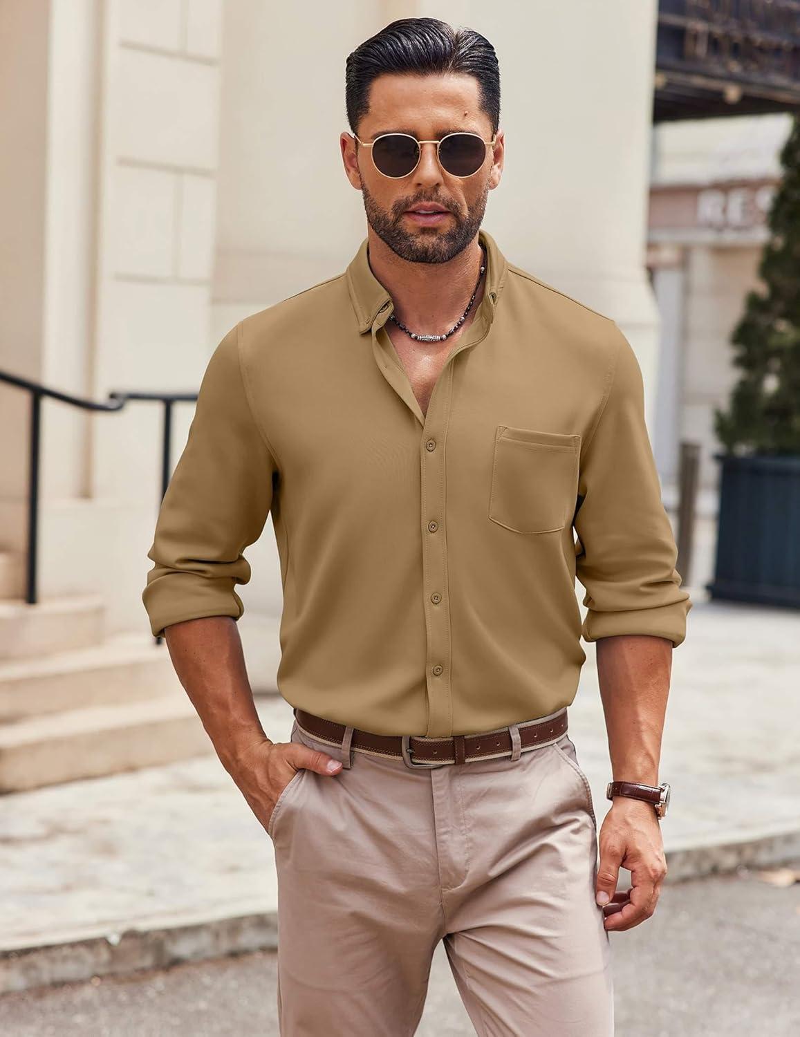COOFANDY Men’s Long Sleeve Wrinkle Free Shirt Casual Button Down Shirts Stretch Dress Shirt with Pocket(Khaki)