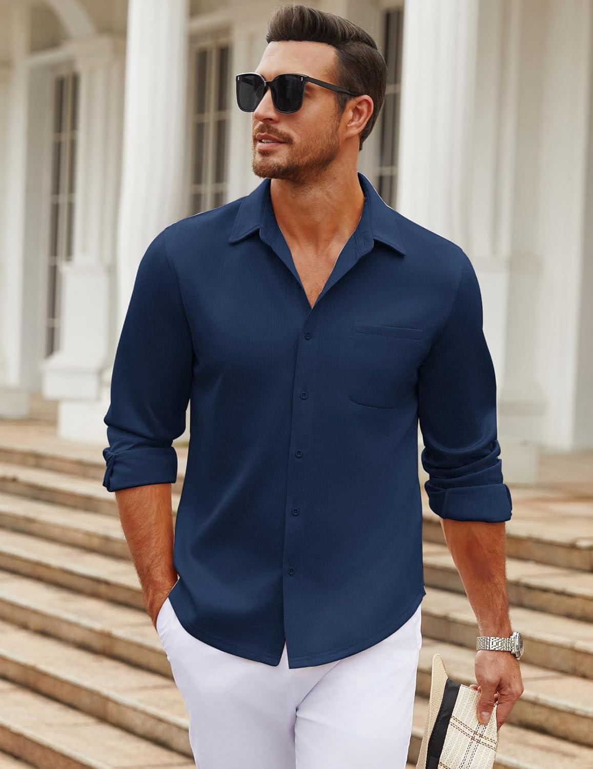 COOFANDY Mens Long Sleeve Button Down Shirt Wrinkle Free Casual Shirt for Men Untucked Shirts with Pocket for Wedding(Deep Blue)