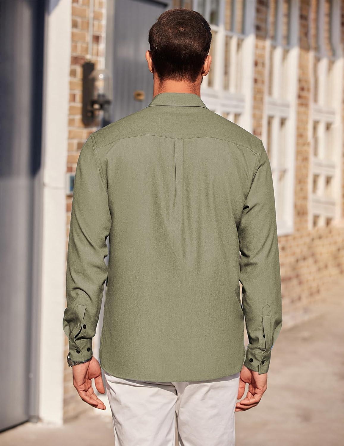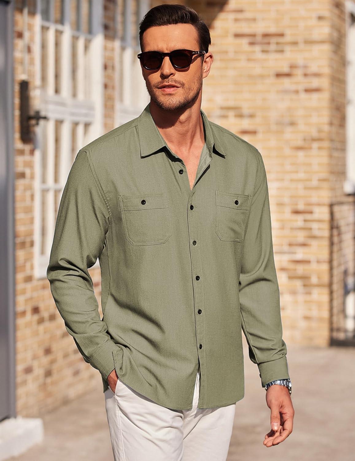 COOFANDY Men’s Casual Button Down Shirt Long Sleeve Linen Chambray Shirt(Army Green)