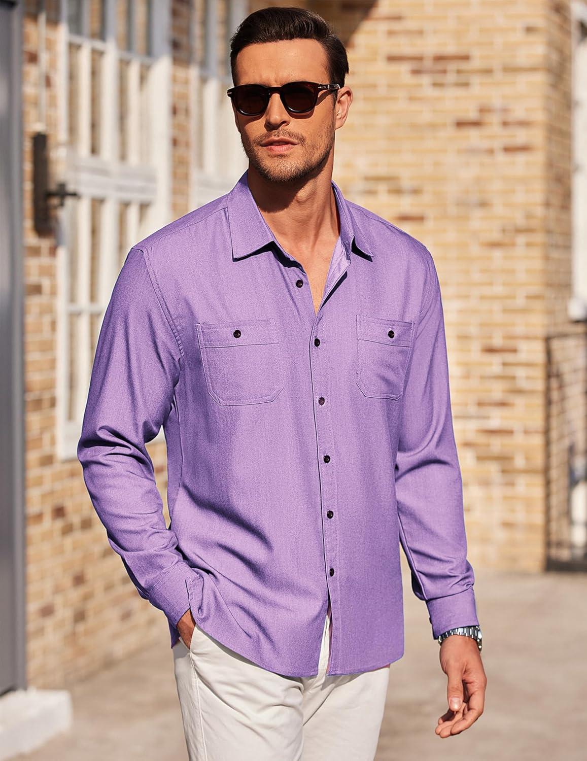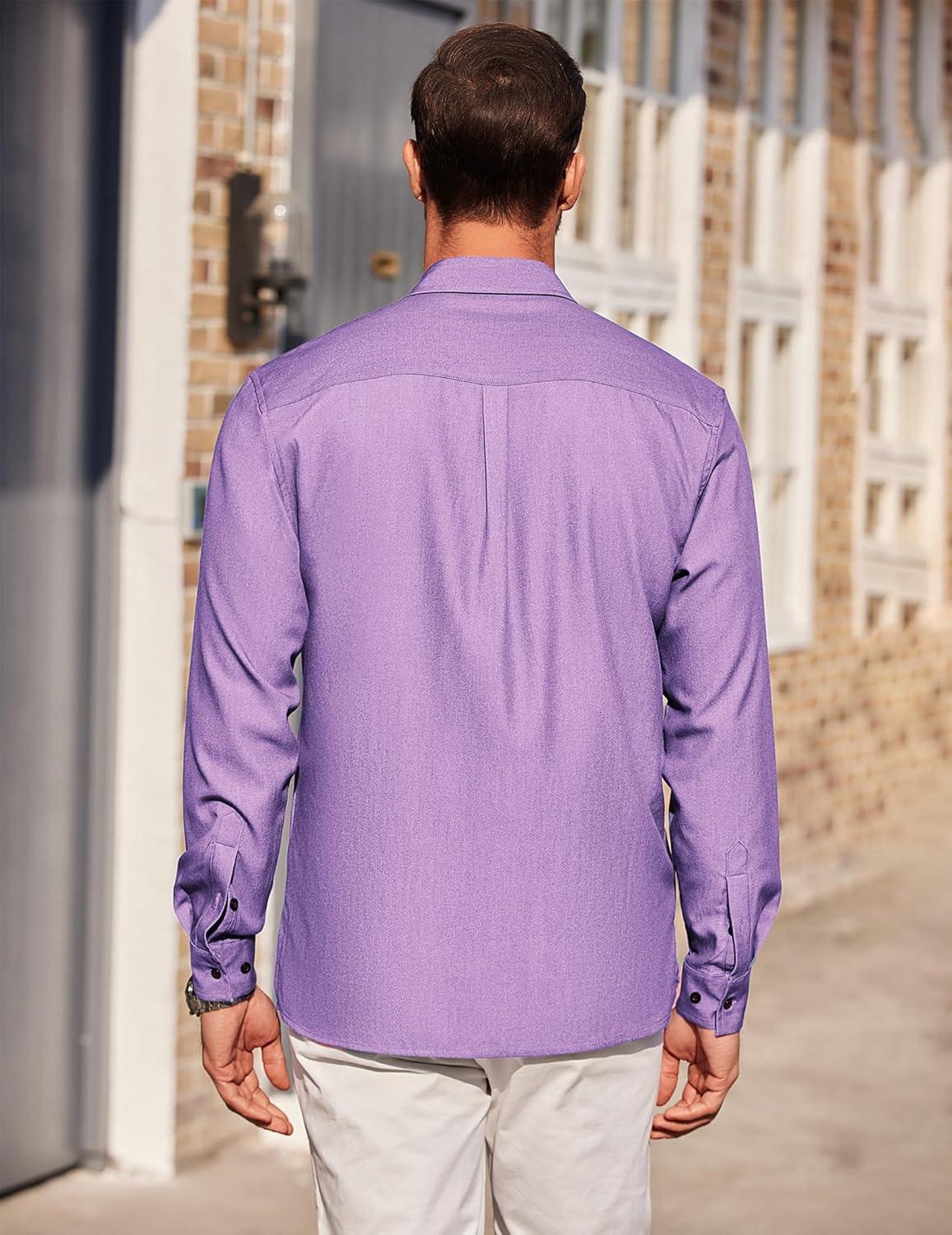 COOFANDY Men’s Casual Button Down Shirt Long Sleeve Linen Chambray Shirt(Purple)
