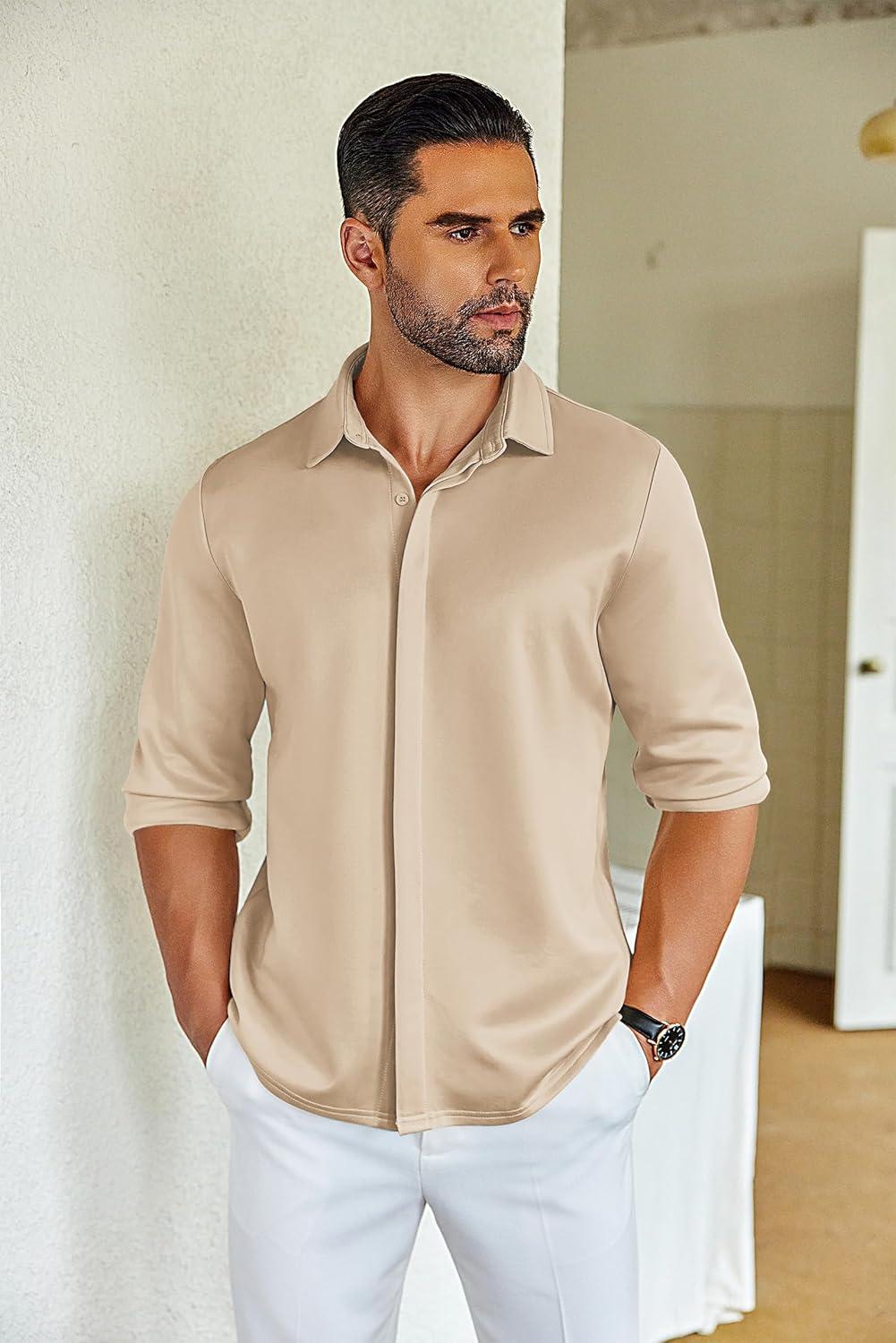 COOFANDY Mens Long Sleeve Button Down Shirt Wrinkle Free Casual Shirt for Men Untucked Shirts with Pocket for Wedding(Khaki)