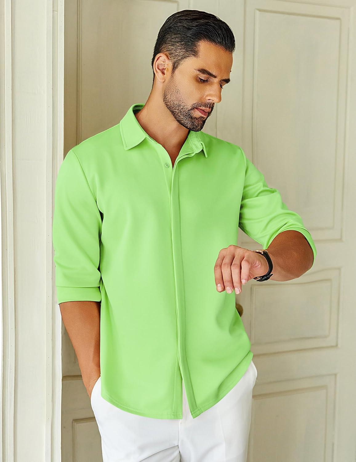 COOFANDY Men’s Casual Button Down Shirt Long Sleeve Linen Chambray Shirt(Bright Green)