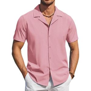 COOFANDY Mens Short Sleeve Shirts Casual Button Down Shirts Cuban Textured Summer Beach Shirts(Pink)