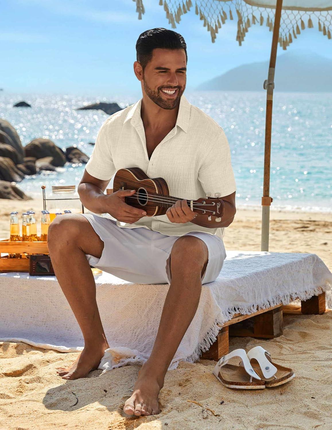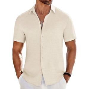 COOFANDY Men’s Casual Button Down Shirts Short Sleeve Textured Summer Beach Shirt(Beige)