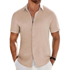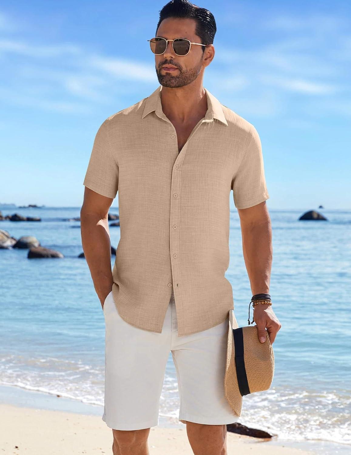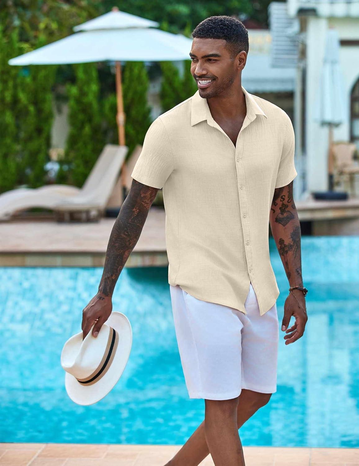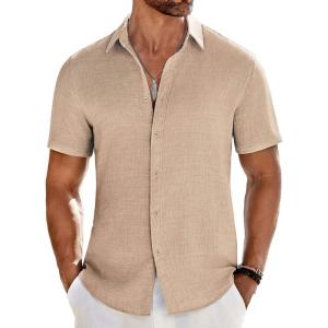 COOFANDY Men’s Casual Button Down Shirts Short Sleeve Textured Summer Beach Shirt(Stone)