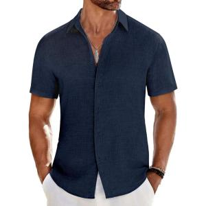 COOFANDY Men’s Casual Button Down Shirts Short Sleeve Textured Summer Beach Shirt(Navy Blue)