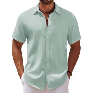 COOFANDY Men’s Casual Summer Beach Shirt Short Sleeve Button Down Shirt Vacation Wedding Shirt Linen Textured Shirts(Light Green)