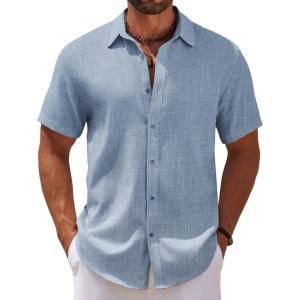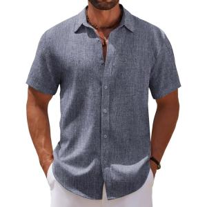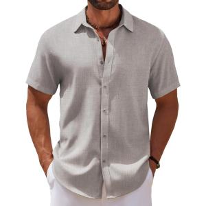 COOFANDY Men’s Casual Summer Beach Shirt Short Sleeve Button Down Shirt Vacation Wedding Shirt Linen Textured Shirts(Light Grey)