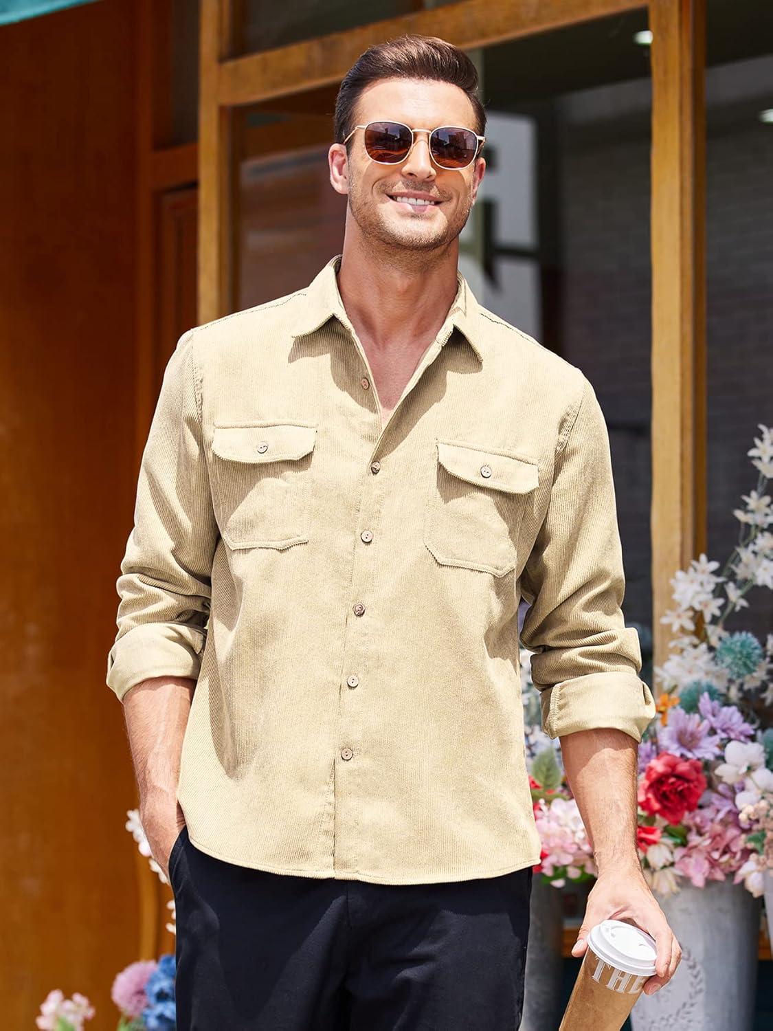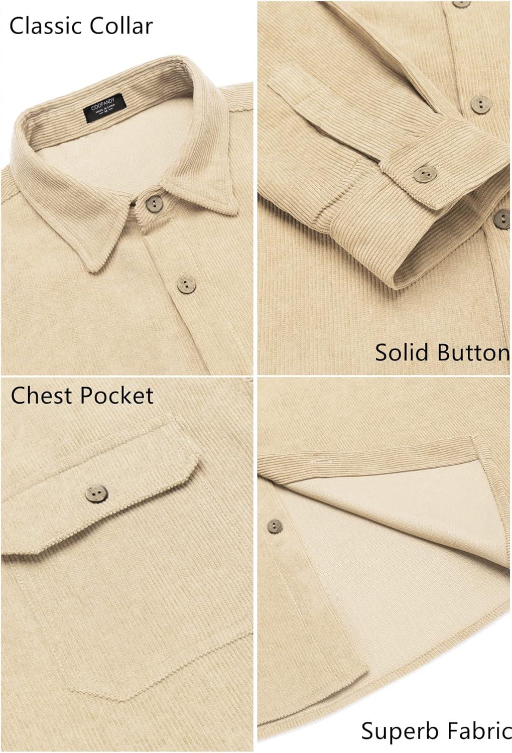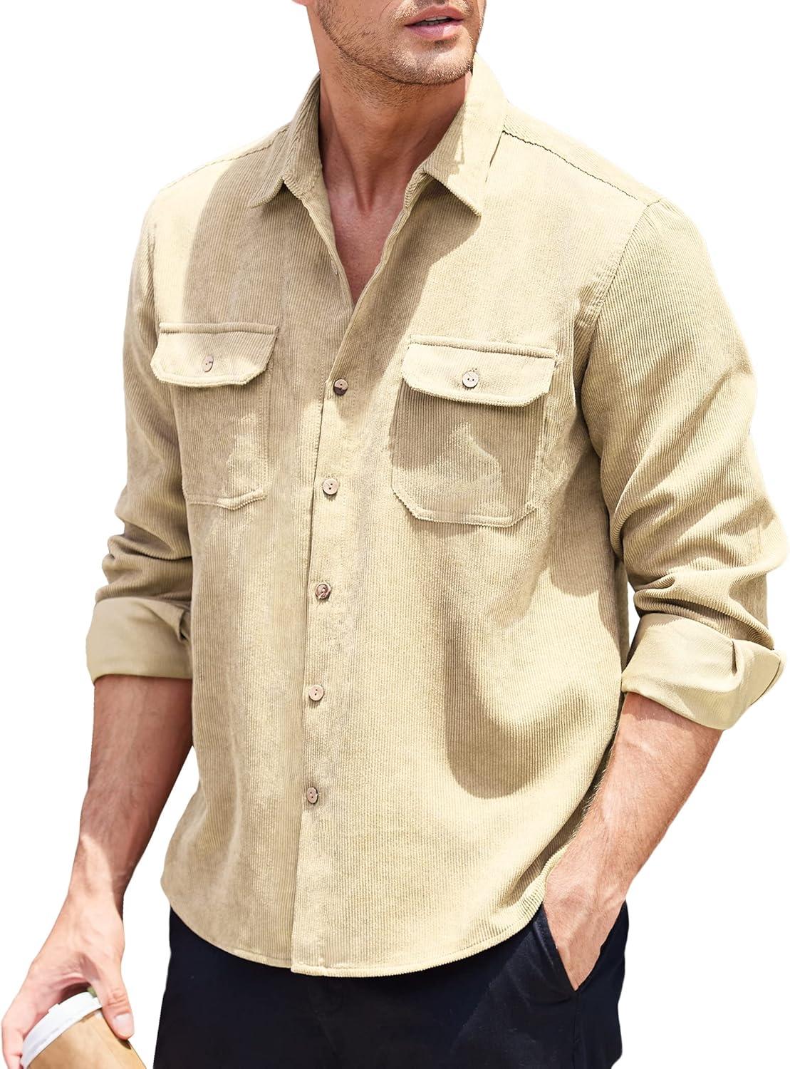 COOFANDY Men’s Corduroy Button Down Shirts Jackets Casual Long Sleeve Shacket Lightweight Overshirts with Flap Pockets(Khaki)