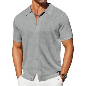 COOFANDY Men’s Knit Shirts Short Sleeve Casual Button Down Polo Shirt Summer Beach Vacation Shirts(Light Gray)