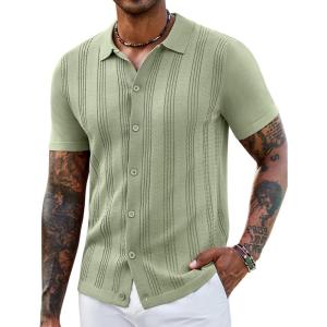 COOFANDY Men’s Knit Shirts Short Sleeve Casual Button Down Polo Shirt Summer Beach Vacation Shirts(Light Green)