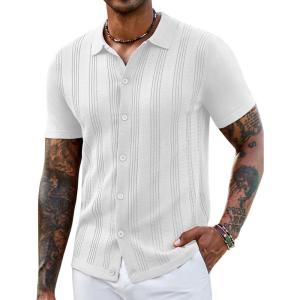 COOFANDY Men’s Knit Shirts Short Sleeve Casual Button Down Polo Shirt Summer Beach Vacation Shirts(White)