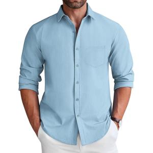 COOFANDY Men’s Long Sleeve Cotton Linen Shirt Beach Button Down Shirts Casual Button Up Shirt Summer Yoga Tops with Pocket(Sky Blue)