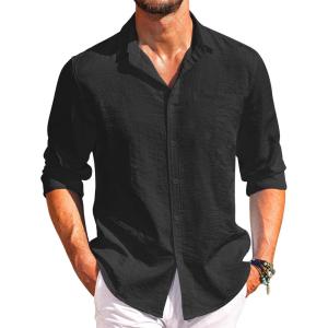 COOFANDY Men’s Long Sleeve Button Down Shirts Casual Cotton Linen Shirts Summer Beach Shirt with Pocket(Black)