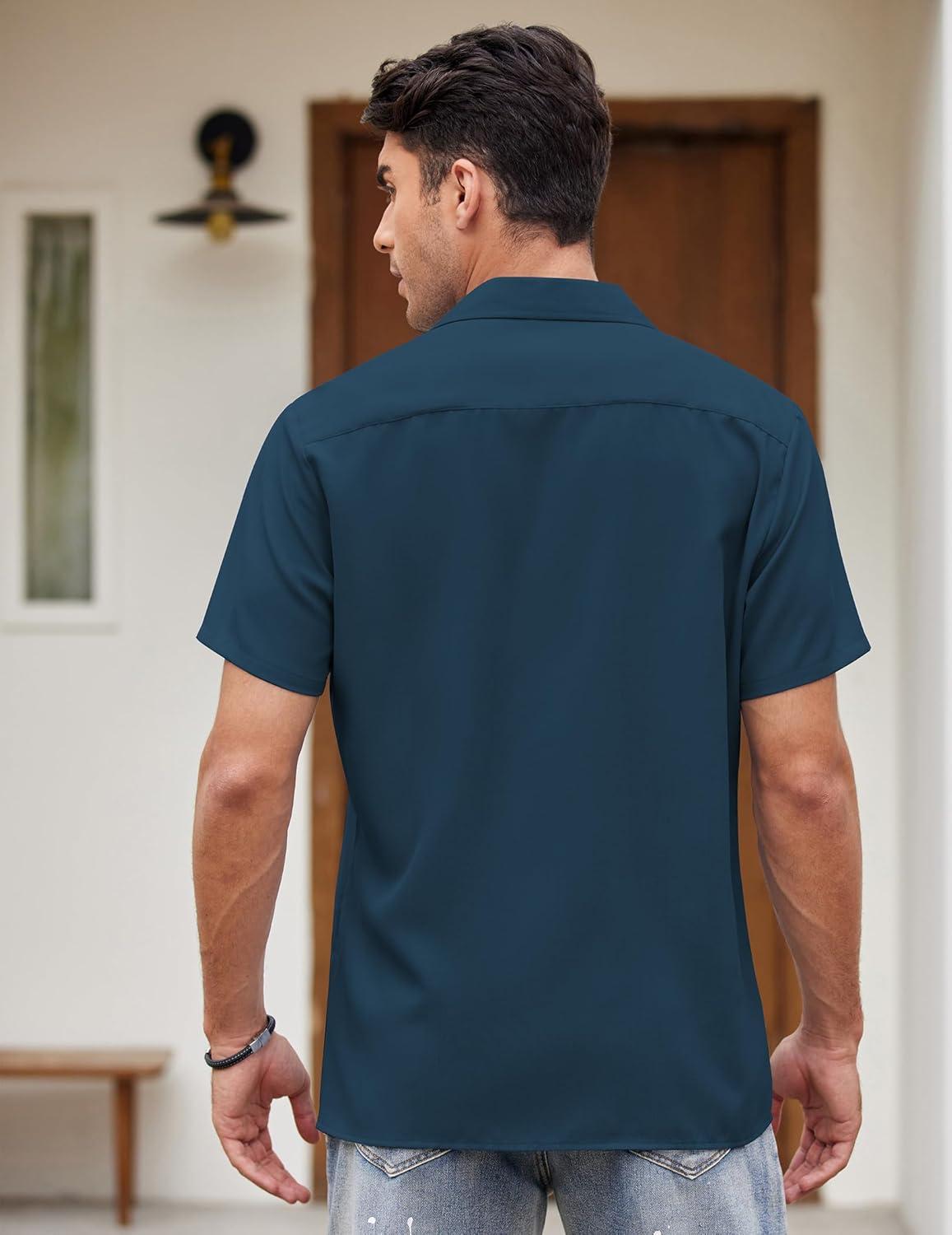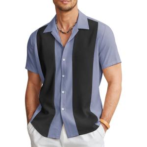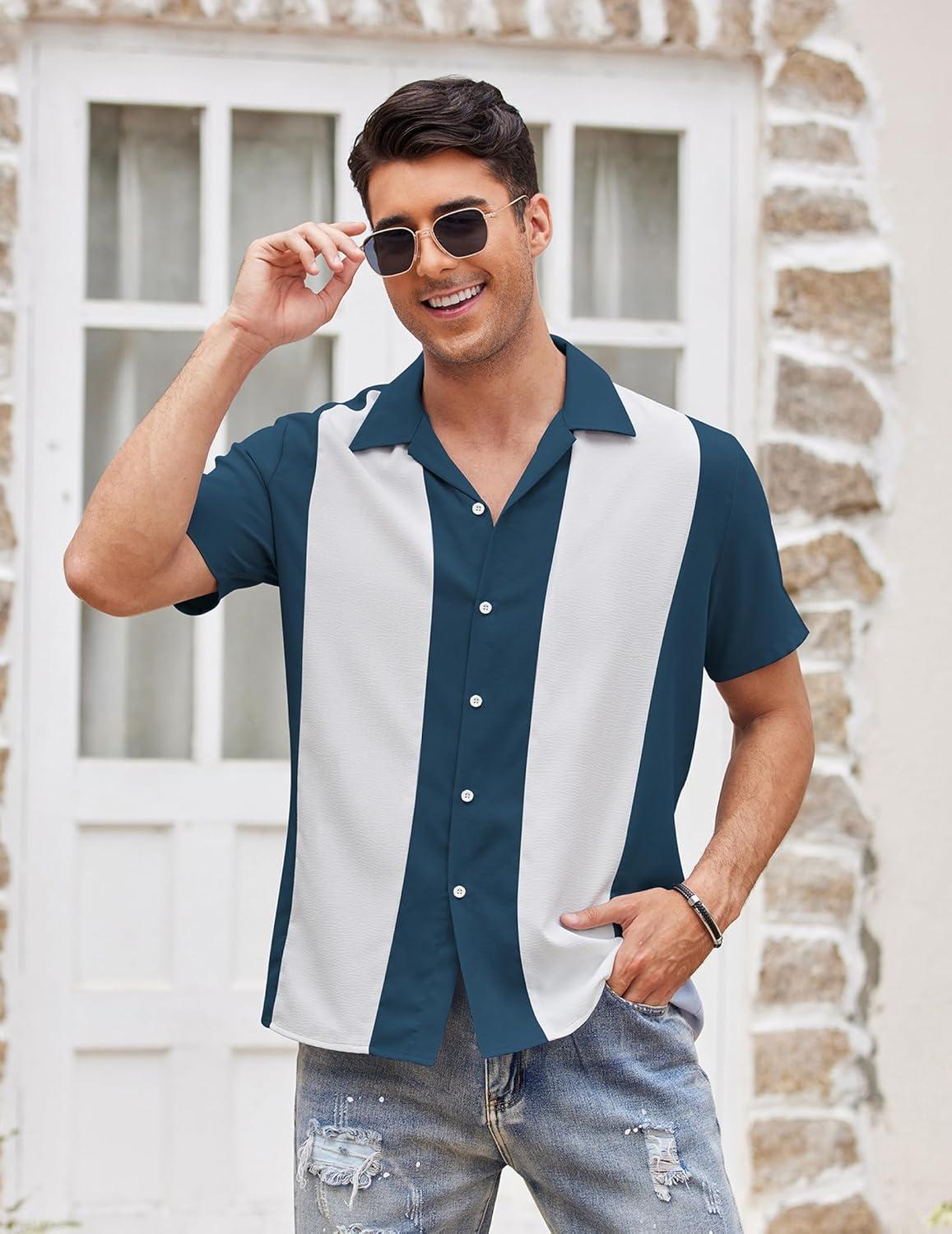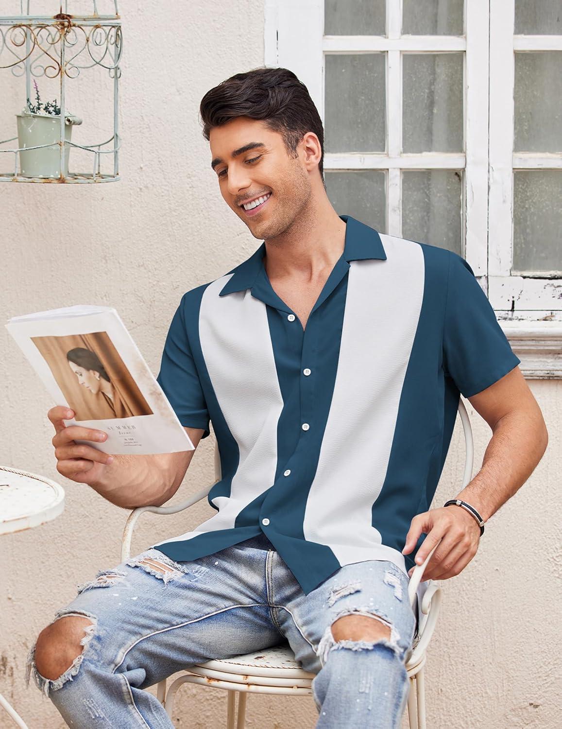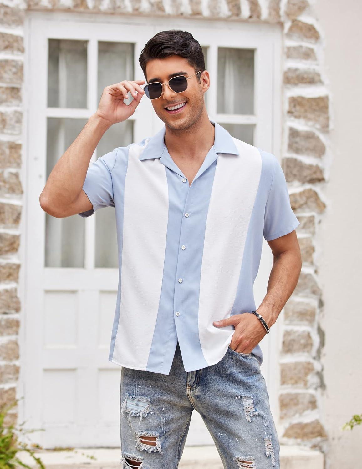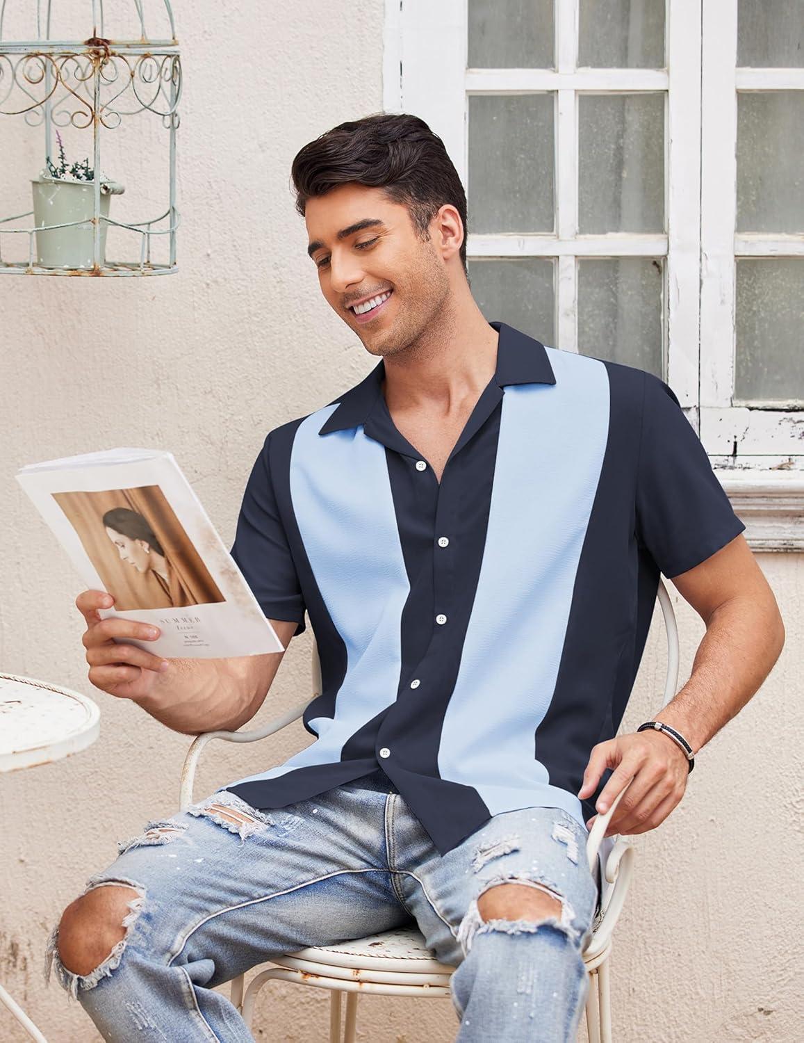 COOFANDY Men’s Vintage Bowling Shirt Short Sleeve Button Down Summer Cuba Beach Shirts(Blue Light Blue)