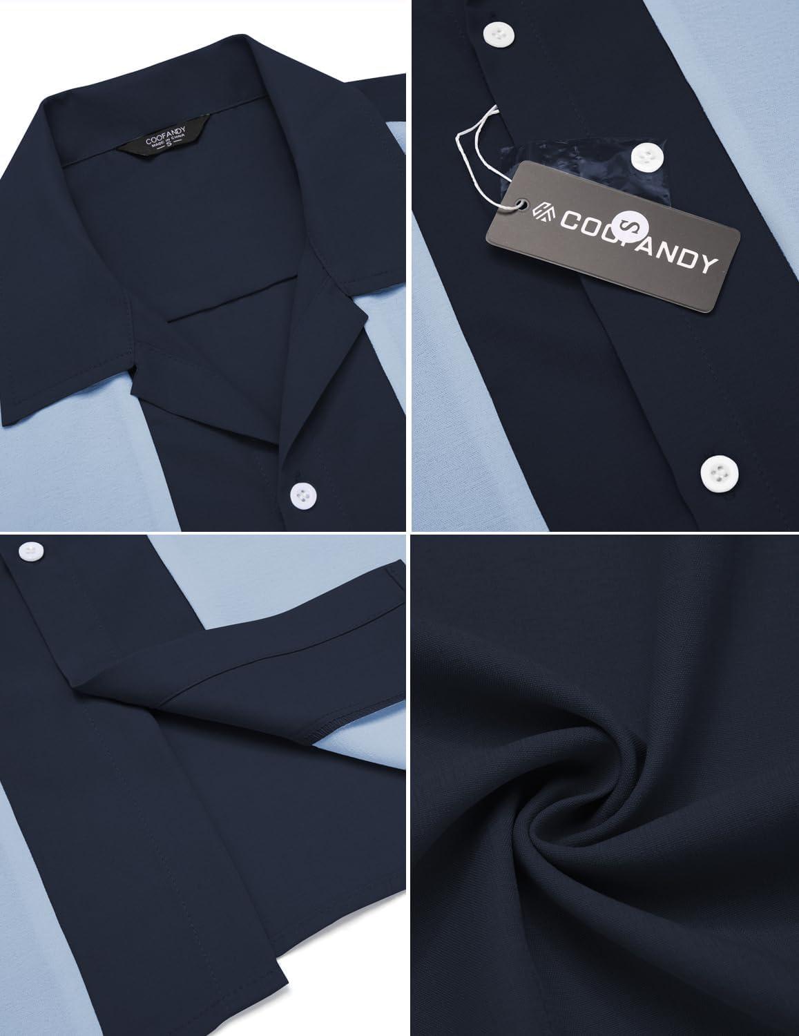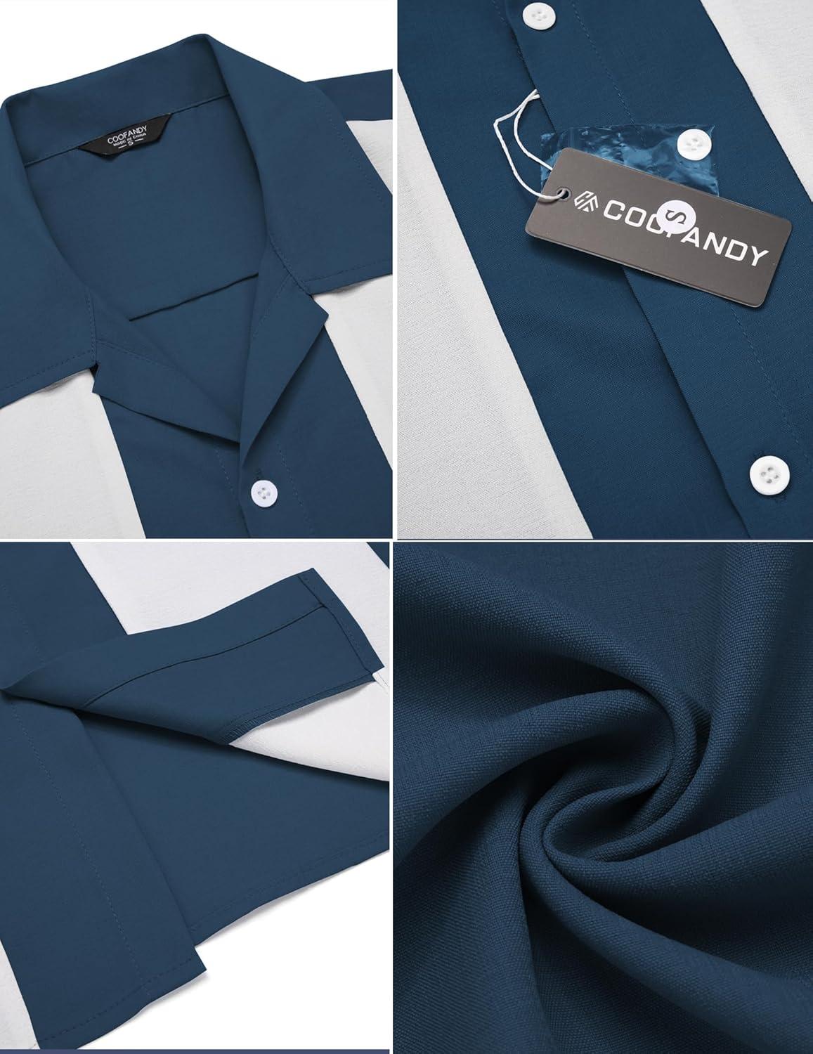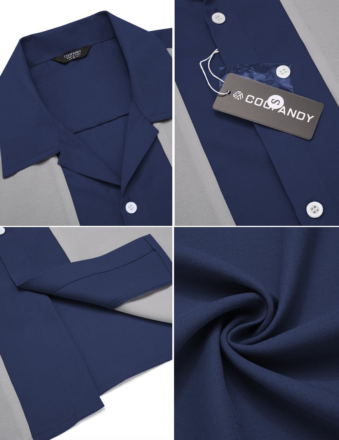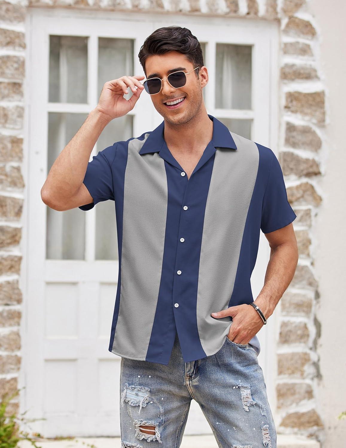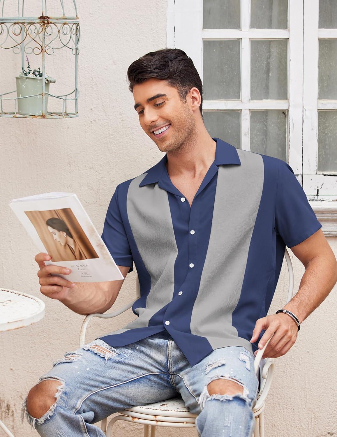 COOFANDY Men’s Vintage Bowling Shirt Short Sleeve Button Down Summer Cuba Beach Shirts(Navy Blue Light Gray)