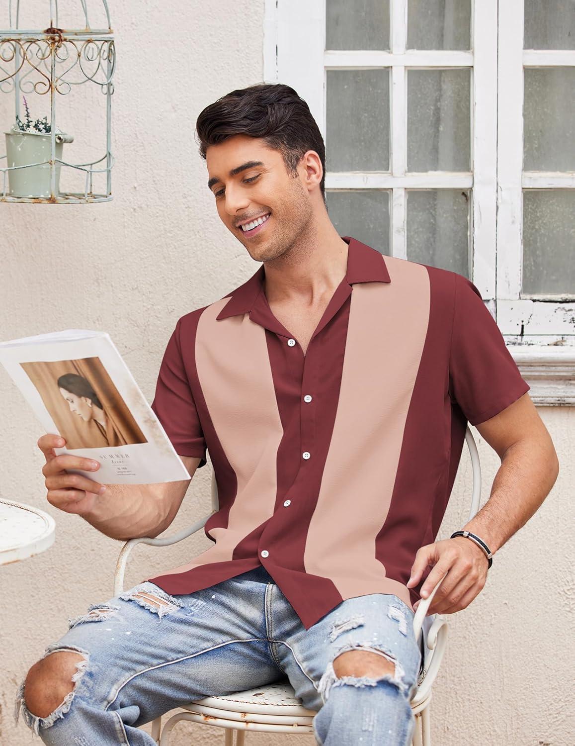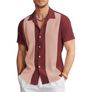 COOFANDY Men’s Vintage Bowling Shirt Short Sleeve Button Down Summer Cuba Beach Shirts(Date Red Pink)