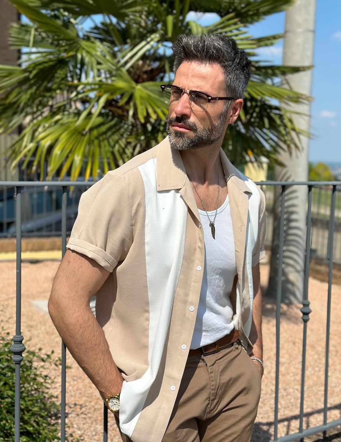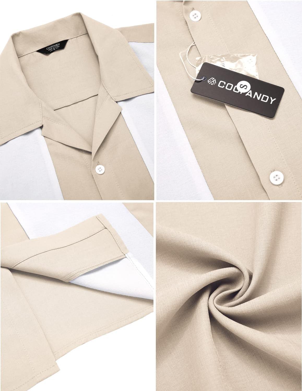 COOFANDY Men’s Vintage Bowling Shirt Short Sleeve Button Down Summer Cuba Beach Shirts(Khaki White)
