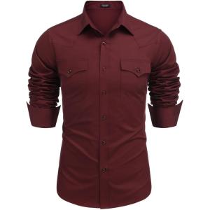 • COOFANDY Men’s Western Cowboy Shirts Long Sleeve Cotton Casual Button Down Work Shirt with Pockets(Solid Wine Red)
