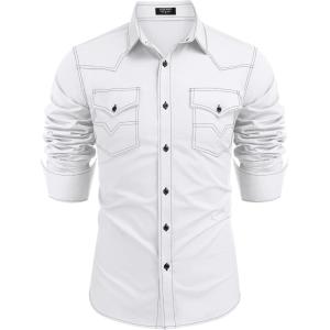 • COOFANDY Men’s Western Cowboy Shirts Long Sleeve Cotton Casual Button Down Work Shirt with Pockets(White)