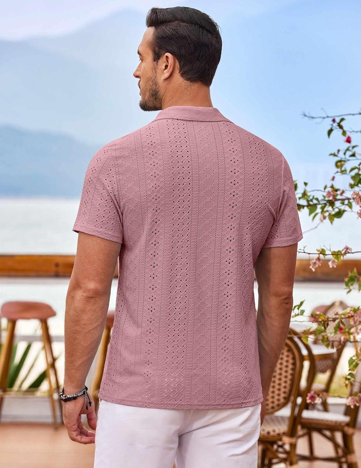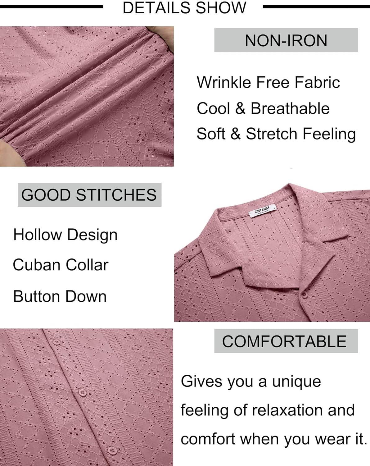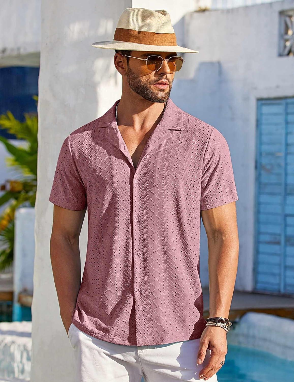 COOFANDY Mens 2025 Fashion Textured Shirts Short Sleeve Summer Beach Shirt Casual Button Down Shirts(Pink)