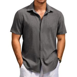 COOFANDY Men’s Casual Button Down Shirt Short Sleeve Textured Summer Cuban Beach Shirts(Dark Gray)