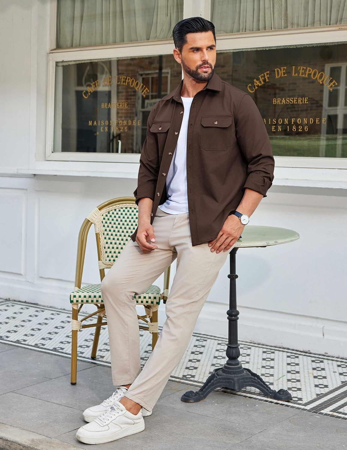 COOFANDY Mens Casual Button Down Shirts Long Sleeve Wrinkle-Free Shirt Lightweight Shirt Jacket(Brown)
