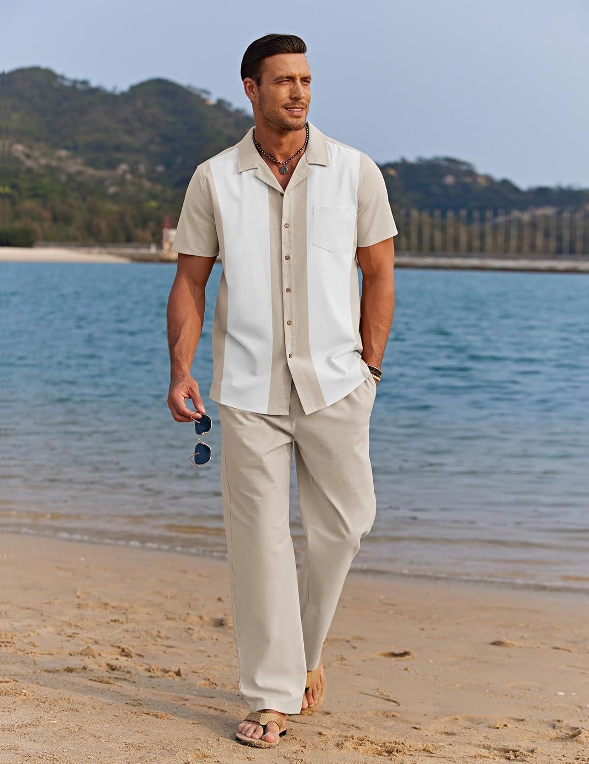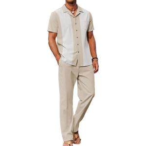 COOFANDY Men 2 Piece Linen Outfit Beach Button Down Shirt Casual Loose Pant Sets(Khaki Patchwork White Shirt/Khaki Pants)