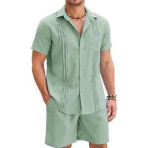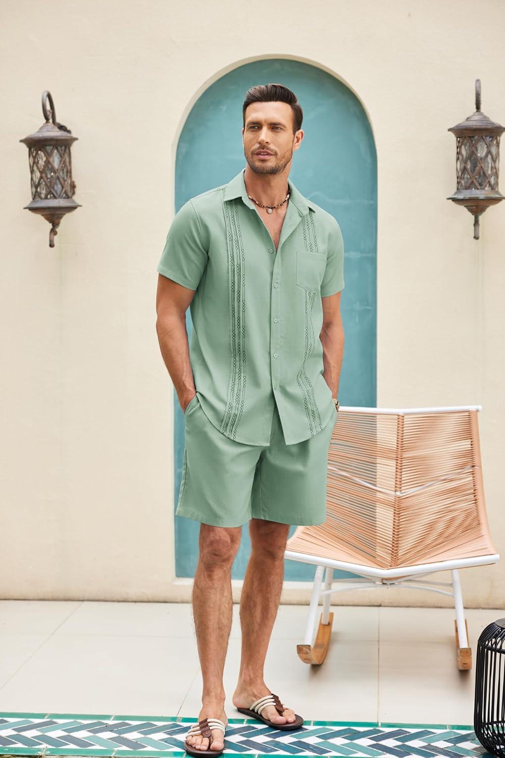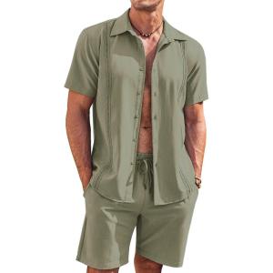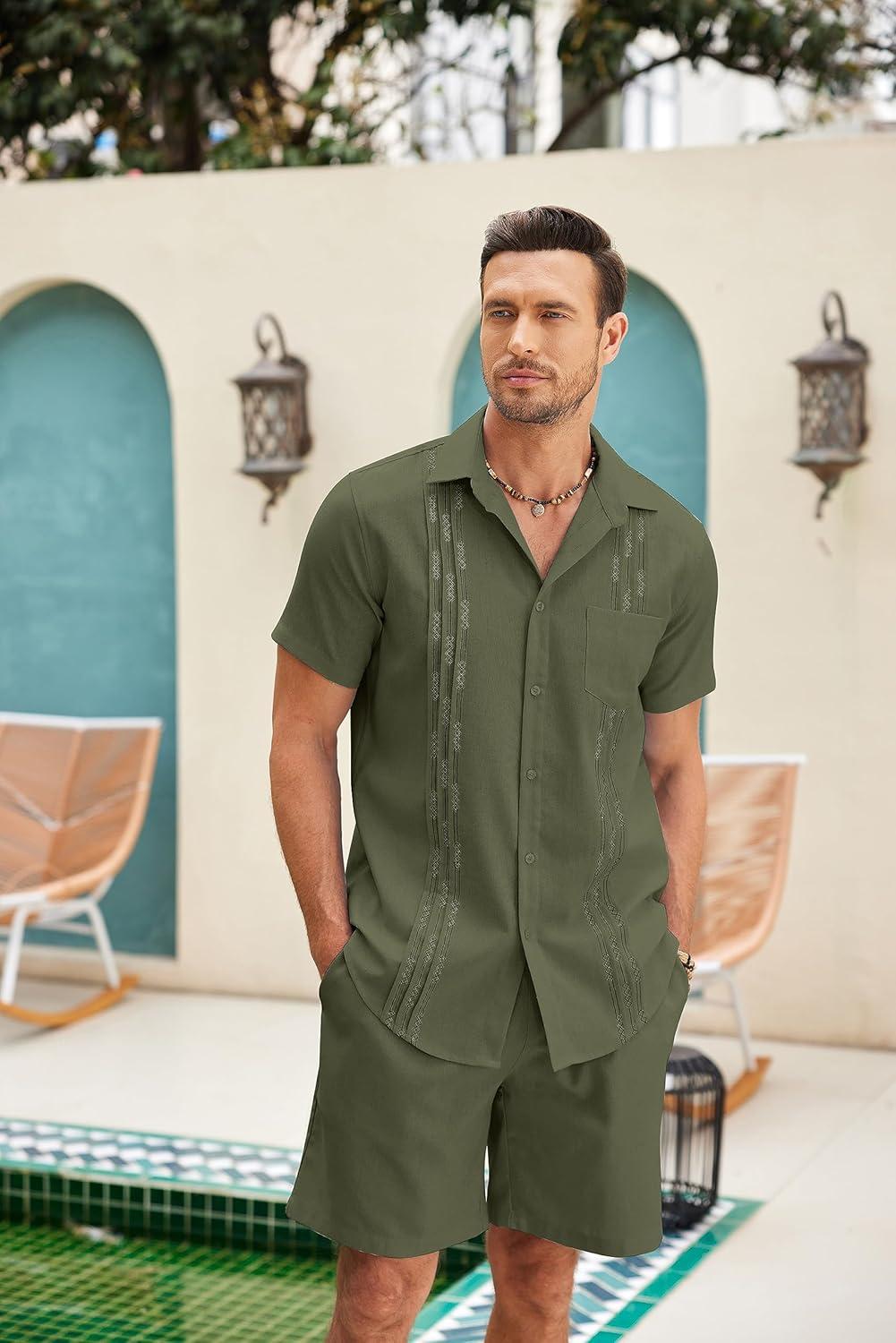 COOFANDY Men’s 2 Piece Short Set Cuban Guayabera Shirts Short Sleeve Casual Beach Outfits Set(Army Green)