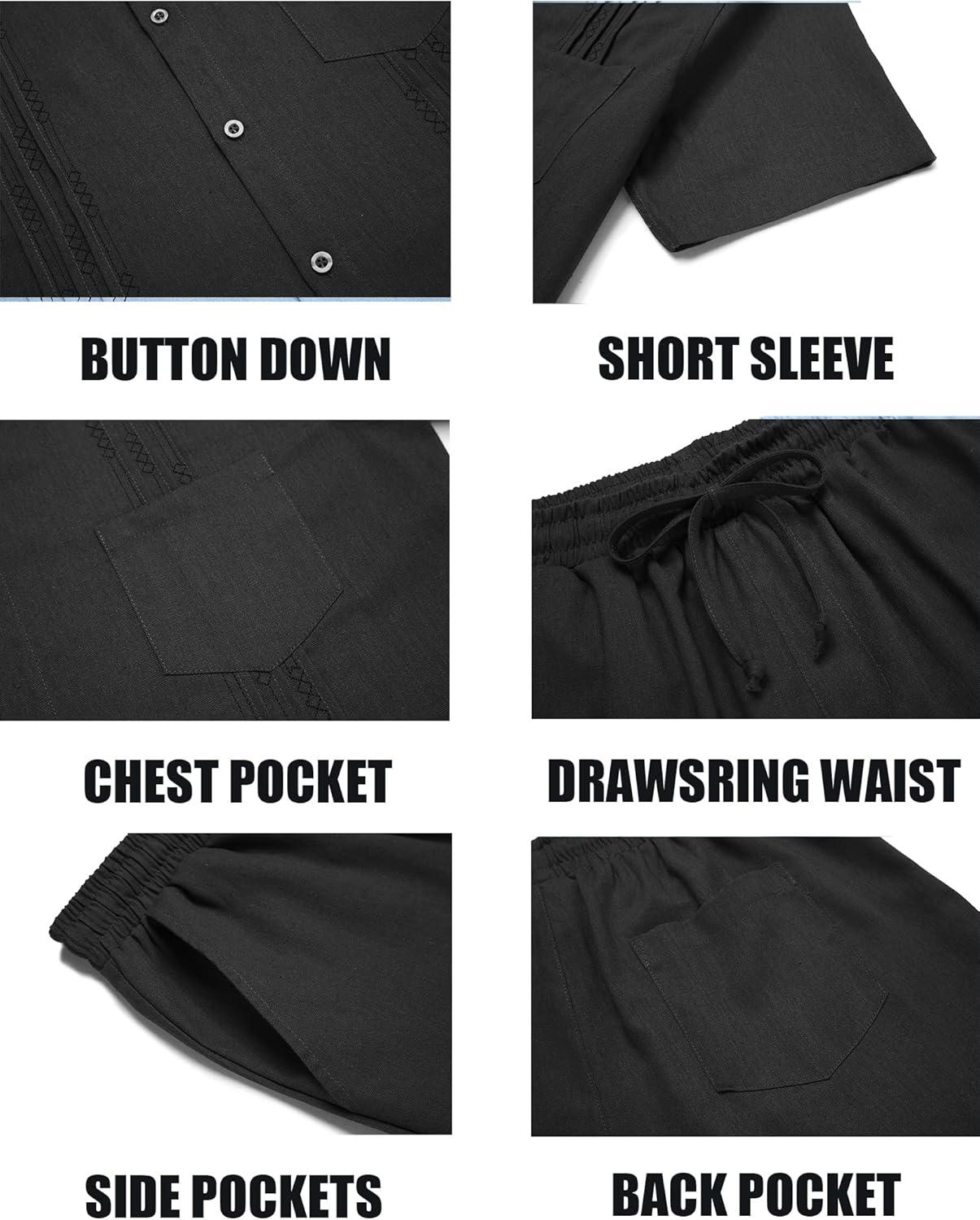 COOFANDY Men Linen Sets Outfits 2 Piece Short Sleeve Cuban Shirts Guayabera Linen Suit(Black)
