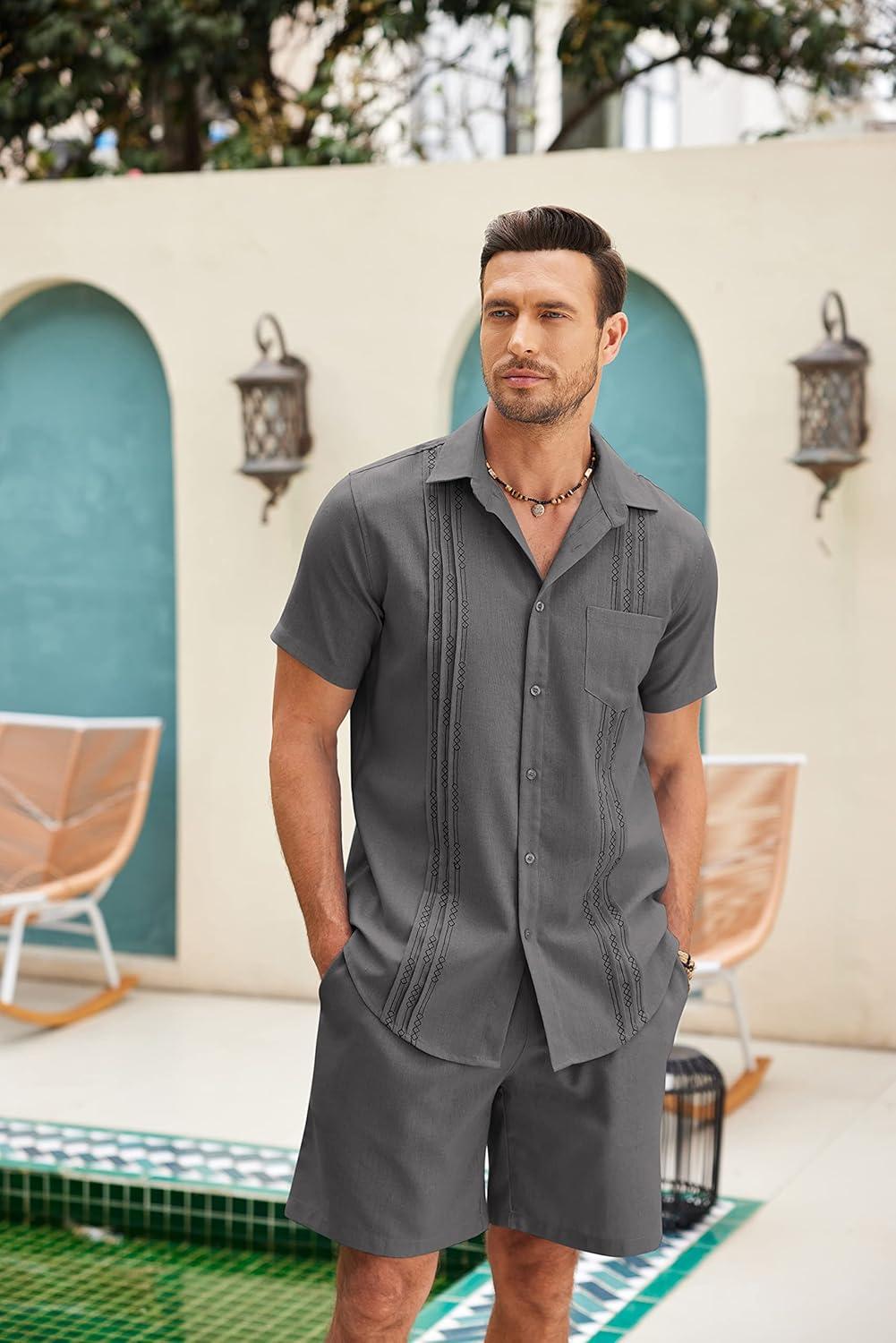 COOFANDY Men’s 2 Piece Short Set Cuban Guayabera Shirts Short Sleeve Casual Beach Outfits Set(Dark Gray)